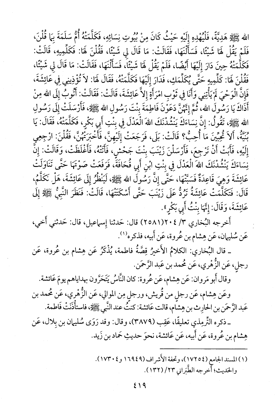 - قال البخاري: الكلام الأخير قصة فاطمة، يذكر عن هشام بن عروة، عن رجل، عن الزُّهْري، عن محمد بن عبد الرَّحمَن.