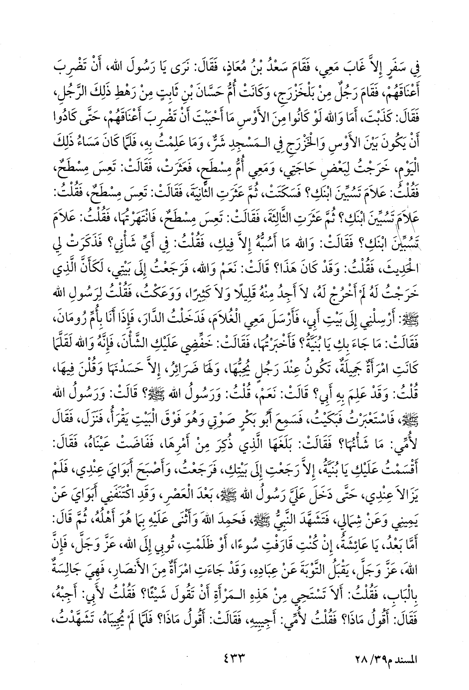 فقام سعد بن معاذ، فقال: نرى يا رسول الله، أن تضرب أعناقهم، فقام رجل من بلخزرج، وكانت أم حسان بن ثابت من رهط ذلك الرجل، فقال: كذبت، أما والله لو كانوا من الأوس ما أحببت أن تضرب أعناقهم، حتى كادوا أن يكون بين الأوس والخزرج في المسجد شر، وما علمت به، فلما كان مساء ذلك اليوم، خرجت لبعض حاجتي، ومعي أم مسطح، فعثرت، فقالت: تعس مسطح، فقلت: علام تسبين ابنك؟ فسكتت، ثم عثرت الثانية، فقالت: تعس مسطح، فقلت: علام تسبين ابنك؟ ثم عثرت الثالثة، فقالت: تعس مسطح، فانتهرتها، فقلت: علام تسبين ابنك؟ فقالت: والله ما أسبه إلا فيك، فقلت: في أي شاني؟ فذكرت لي الحديث، فقلت: وقد كان هذا؟ قالت: نعم والله، فرجعت إلى بيتي، لكأن الذي خرجت له لم أخرج له، لا أجد منه قليلا ولا كثيرا، ووعكت، فقلت لرسول الله صَلى الله عَليه وسَلم: أرسلني إلى بيت أبي، فأرسل معي الغلام، فدخلت الدار، فإذا أنا بأم رومان، فقالت: ما جاء بك يا بنية؟ فأخبرتها، فقالت: خفضي عليك الشان، فإنه والله لقلما كانت امرأة جميلة، تكون عند رجل يحبها، ولها ضرائر، إلا حسدنها وقلن فيها، قلت: وقد علم به أبي؟ قالت: نعم، قلت: ورسول الله صَلى الله عَليه وسَلم؟ قالت: ورسول الله صَلى الله عَليه وسَلم فاستعبرت فبكيت، فسمع أَبو بكر صوتي وهو فوق البيت يقرأ، فنزل، فقال لأمي: ما شانها؟ فقالت: بلغها الذي ذكر من أمرها، ففاضت عيناه، فقال: أقسمت عليك يا بنية، إلا رجعت إلى بيتك، فرجعت، وأصبح أَبواي عندي، فلم يزالا عندي، حتى دخل علي رسول الله صَلى الله عَليه وسَلم بعد العصر، وقد اكتنفني أَبواي عن يميني وعن شمالي، فتشهد النبي صَلى الله عَليه وسَلم فحمد الله وأثنى عليه بما هو أهله، ثم قال: أما بعد، يا عائشة، إن كنت قارفت سوءا، أو ظلمت، توبي إلى الله، عز وجل، فإن الله، عز وجل، يقبل التوبة عن عباده، وقد جاءت امرأة من الأنصار، فهي جالسة بالباب، فقلت: ألا تستحي من هذه المرأة أن تقول شيئا؟ فقلت لأبي: أجبه، فقال: أقول ماذا؟ فقلت لأمي: أجيبيه، فقالت: أقول ماذا؟ فلما لم يجيباه، تشهدت،