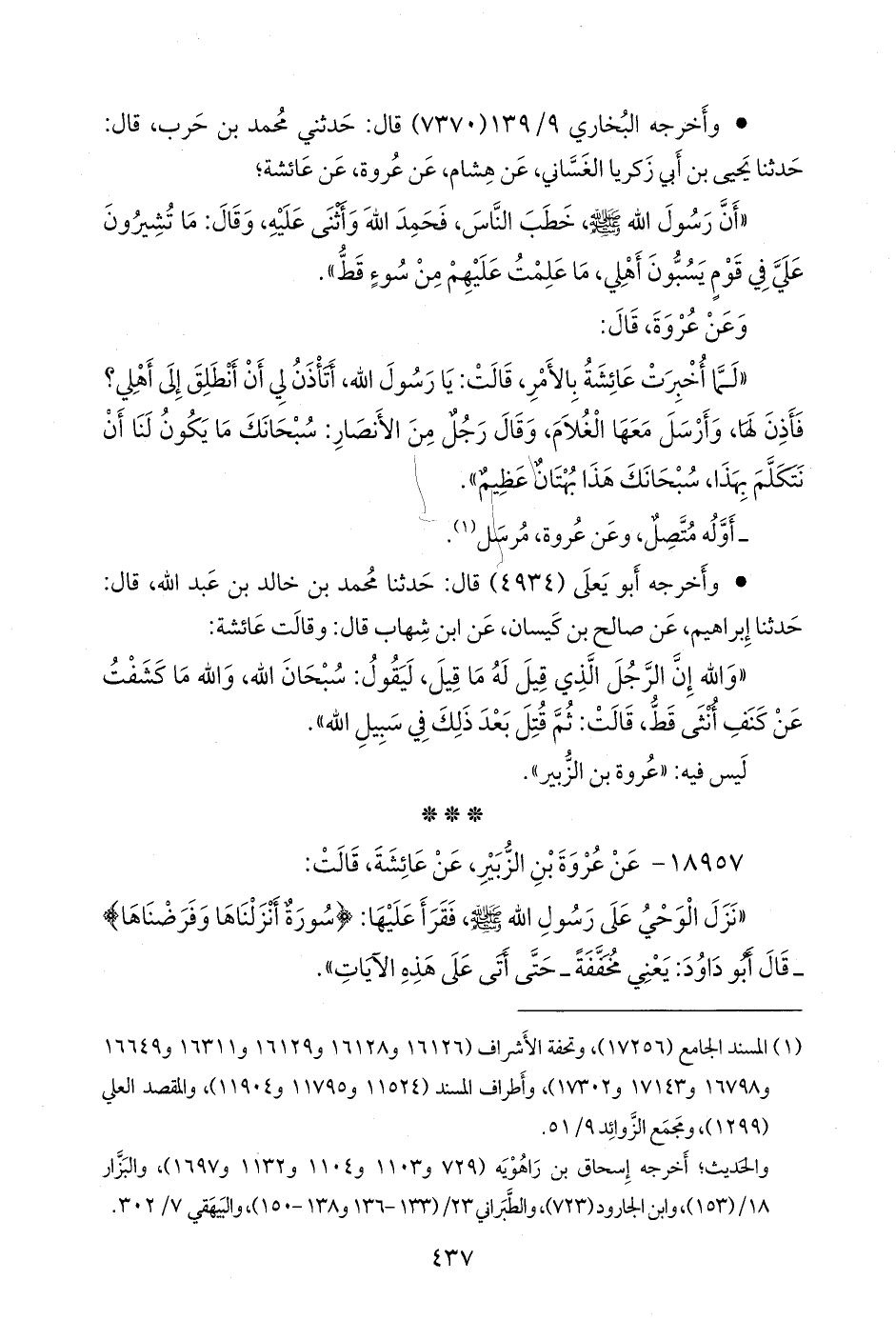 ١٨٩٥٧ - عن عروة بن الزبير، عن عائشة، قالت: