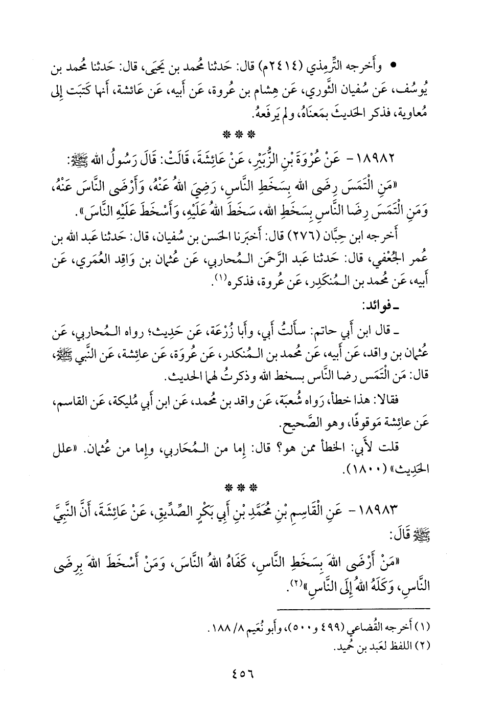 - قلنا: إِسناده ضعيفٌ؛ قال ابن أبي حاتم: سألت أبي، وأَبا زُرعَة، عن حديث؛ رواه المحاربي، عن عثمان بن واقد، عن أبيه، عن محمد بن المُنكدِر، عن عروة، عن عائشة، عن النبي صَلى الله عَليه وسَلم قال: من التمس رضا الناس بسخط الله وذكرت لهما الحديث.