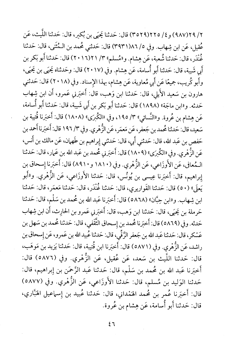 وفي (٥٨٧١) قال: أخبرنا ابن قتيبة، قال: حدثنا يزيد بن مَوهَب، قال: حدثنا الليث بن سعد، عن عقيل، عن الزُّهْري. وفي (٥٨٧٦) قال: أخبرنا عبد الله بن محمد بن سَلم، قال: حدثنا عبد الرَّحمَن بن إبراهيم، قال: حدثنا الوليد بن مسلم، قال: حدثنا الأوزاعي، عن الزُّهْري. وفي (٥٨٧٧) قال: أخبرنا عمر بن محمد الهمداني، قال: حدثنا عبيد بن إسماعيل الهباري، قال: حدثنا أَبو أسامة، عن هشام بن عروة.