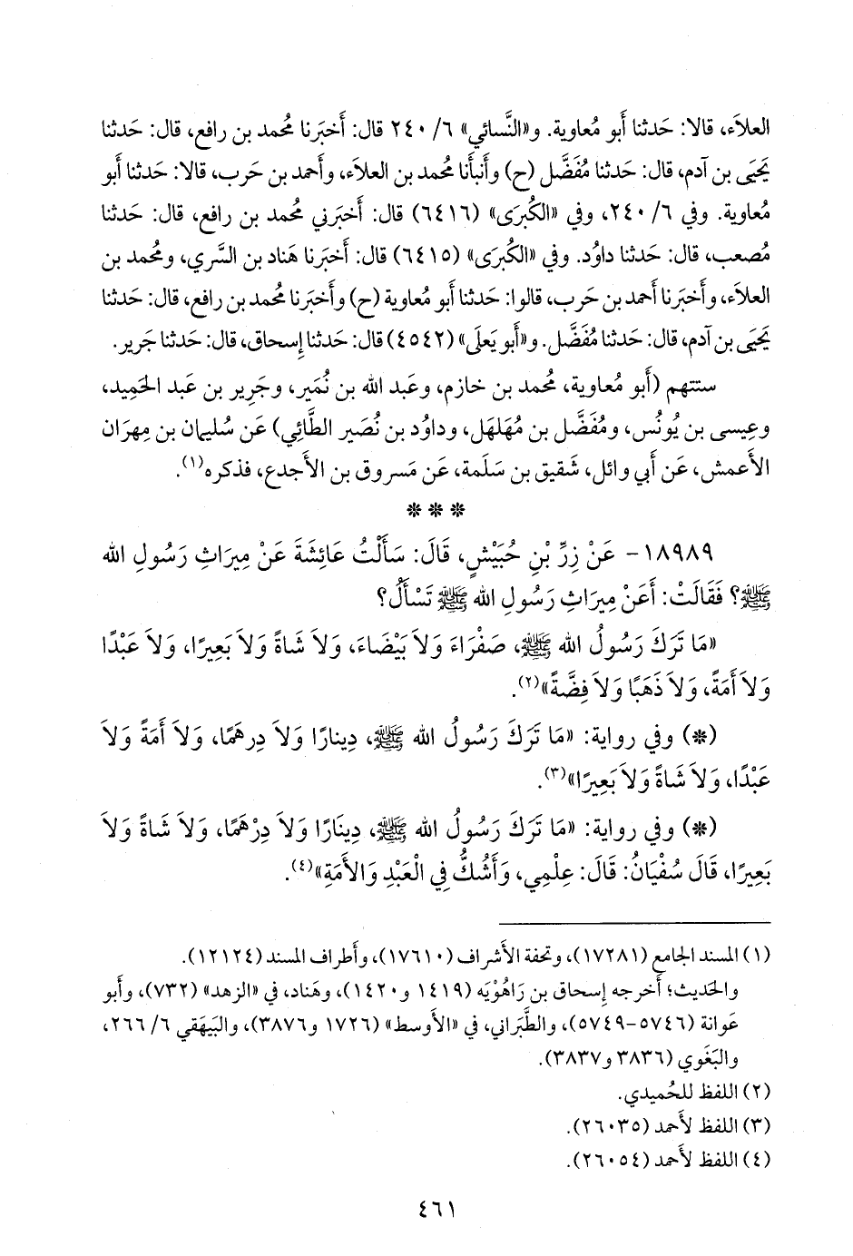 - وفي رواية: «عن زِرّ بن حُبَيش، قال: سألت عائشة عن ميراث رسول الله صَلى الله عَليه وسَلم؟ فقالت: تسألوني عن ميراث رسول الله صَلى الله عَليه وسَلم؟ ما ترك رسول الله صَلى الله عَليه وسَلم دينارا ولا درهما، ولا شاة ولا بعيرا، ولا أوصى بشيء» (¬٥).