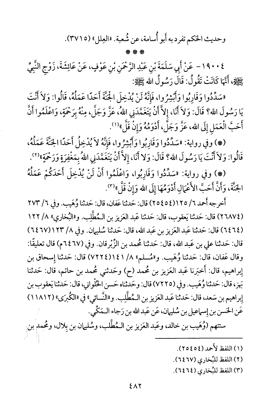 - وفي رواية: «سددوا وقاربوا، واعلموا أن لن يدخل أحدكم عمله الجنة، وأن أحب الأعمال أدومها إلى الله وإن قل» (¬٣).