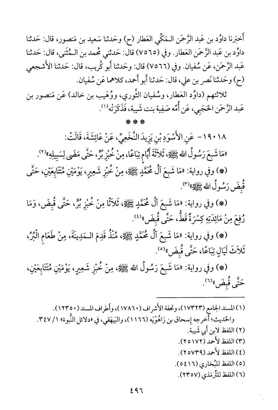 - وفي رواية: «ما شبع آل محمد صَلى الله عَليه وسَلم منذ قدم المدينة، من طعام البر، ثلاث ليال تباعا، حتى قبض» (¬٤).