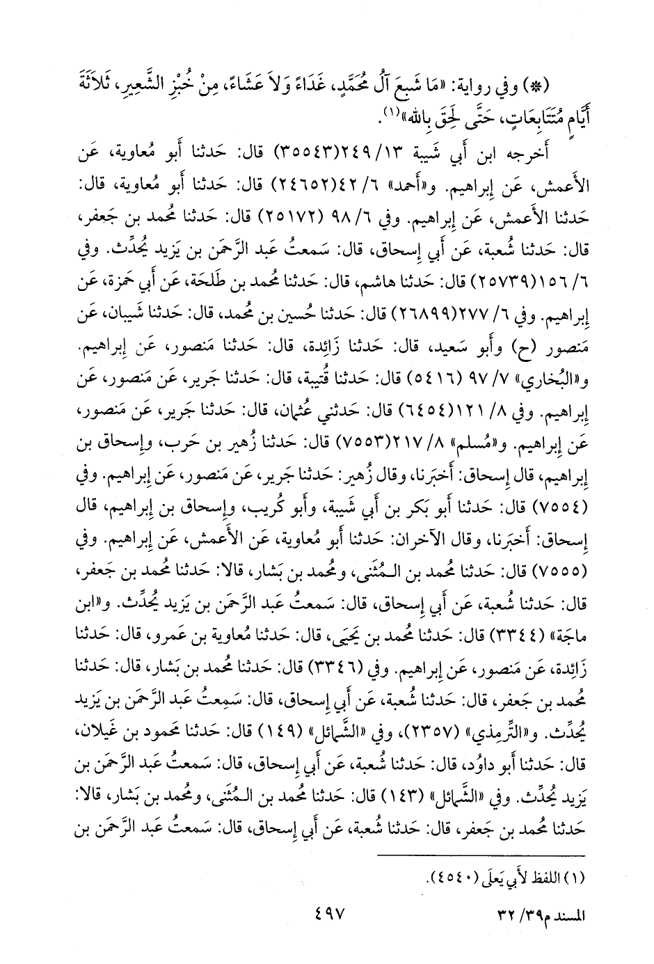 أخرجه ابن أبي شيبة (٣٥٥٤٣) قال: حدثنا أَبو معاوية، عن الأعمش، عن إبراهيم. و «أحمد» ٦/ ٤٢ (٢٤٦٥٢) قال: حدثنا أَبو معاوية, قال: حدثنا الأعمش، عن إبراهيم. وفي ٦/ ٩٨ (٢٥١٧٢) قال: حدثنا محمد بن جعفر، قال: حدثنا شعبة، عن أبي إسحاق, قال: سمعت عبد الرَّحمَن بن يزيد يحدث. وفي ٦/ ١٥٦ (٢٥٧٣٩) قال: حدثنا هاشم, قال: حدثنا محمد بن طلحة، عن أبي حمزة، عن إبراهيم. وفي ٦/ ٢٧٧ (٢٦٨٩٩) قال: حدثنا حسين بن محمد, قال: حدثنا شَيبان، عن منصور (ح) وأَبو سعيد, قال: حدثنا زائدة, قال: حدثنا منصور، عن إبراهيم. و «البخاري» ٧/ ٩٧ (٥٤١٦) قال: حدثنا قتيبة, قال: حدثنا جرير، عن منصور، عن إبراهيم. وفي ٨/ ١٢١ (٦٤٥٤) قال: حدثني عثمان, قال: حدثنا جرير، عن منصور، عن إبراهيم. و «مسلم» ٨/ ٢١٧ (٧٥٥٣) قال: حدثنا زهير بن حرب، وإسحاق بن إبراهيم, قال إسحاق: أخبرنا، وقال زهير: حدثنا جرير، عن منصور، عن إبراهيم. وفي (٧٥٥٤) قال: حدثنا أَبو بكر بن أبي شيبة، وأَبو كُريب، وإسحاق بن إبراهيم, قال إسحاق: أخبرنا، وقال الآخران: حدثنا أَبو معاوية، عن الأعمش، عن إبراهيم. وفي (٧٥٥٥) قال: حدثنا محمد بن المثنى، ومحمد بن بشار, قالا: حدثنا محمد بن جعفر، قال: حدثنا شعبة، عن أبي إسحاق, قال: سمعت عبد الرَّحمَن بن يزيد يحدث. و «ابن ماجة» (٣٣٤٤) قال: حدثنا محمد بن يحيى, قال: حدثنا معاوية بن عَمرو, قال: حدثنا زائدة، عن منصور، عن إبراهيم. وفي (٣٣٤٦) قال: حدثنا محمد بن بشار, قال: حدثنا محمد بن جعفر، قال: حدثنا شعبة، عن أبي إسحاق, قال: سمعت عبد الرَّحمَن بن يزيد يحدث. و «التِّرمِذي» (٢٣٥٧)، وفي «الشمائل» (١٤٩) قال: حدثنا محمود بن غَيلان, قال: حدثنا أَبو داود، قال: حدثنا شعبة، عن أبي إسحاق, قال: سمعت عبد الرَّحمَن بن يزيد يحدث.