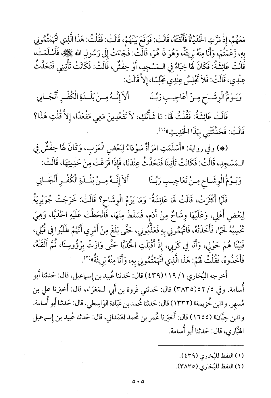 - وفي رواية: «أسلمت امرأة سوداء لبعض العرب، وكان لها حفش في المسجد، قالت: فكانت تاتينا فتحدث عندنا، فإذا فرغت من حديثها، قالت: