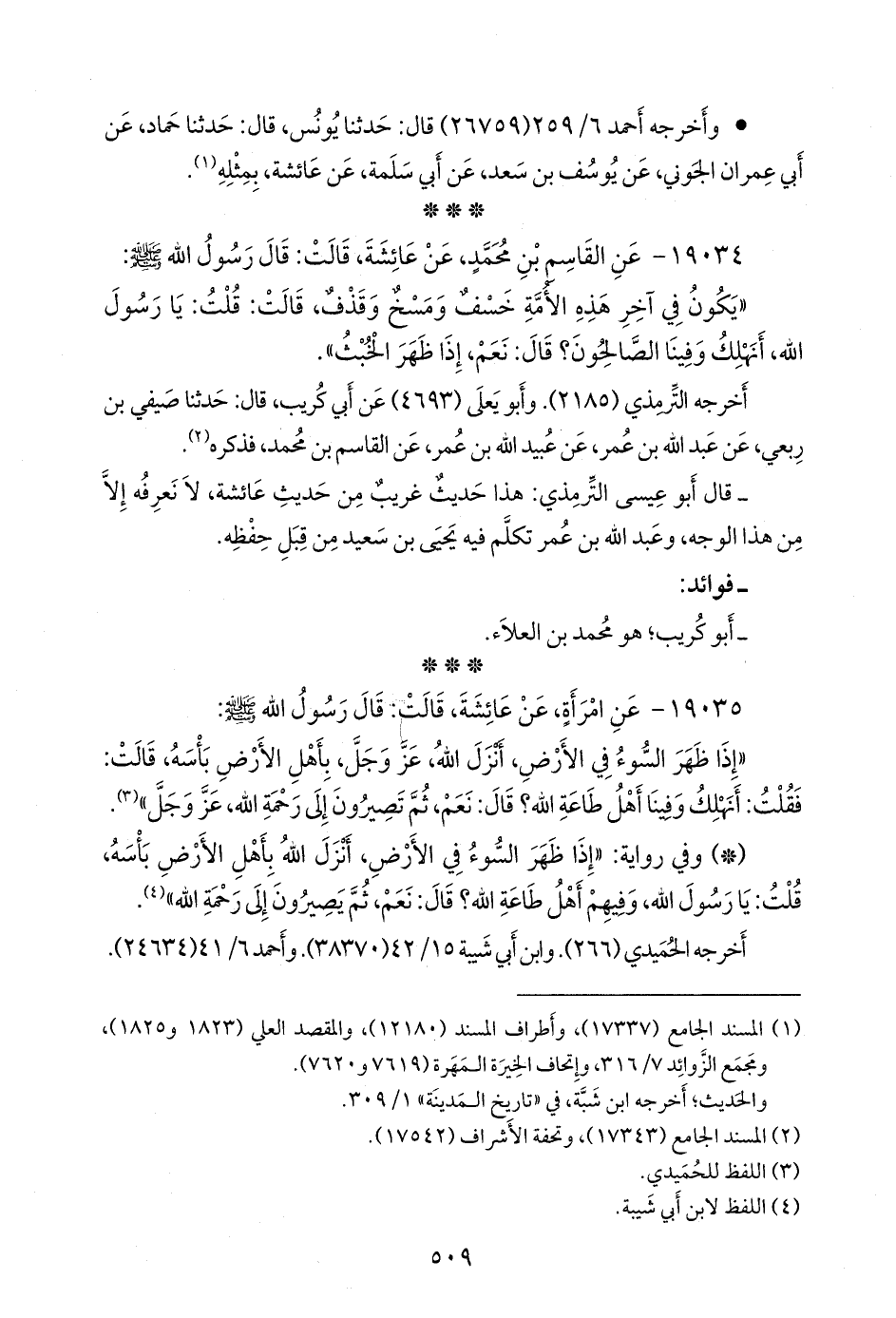 «يكون في آخر هذه الأمة خسف ومسخ وقذف، قالت: قلت: يا رسول الله، أنهلك وفينا الصالحون؟ قال: نعم، إذا ظهر الخبث».