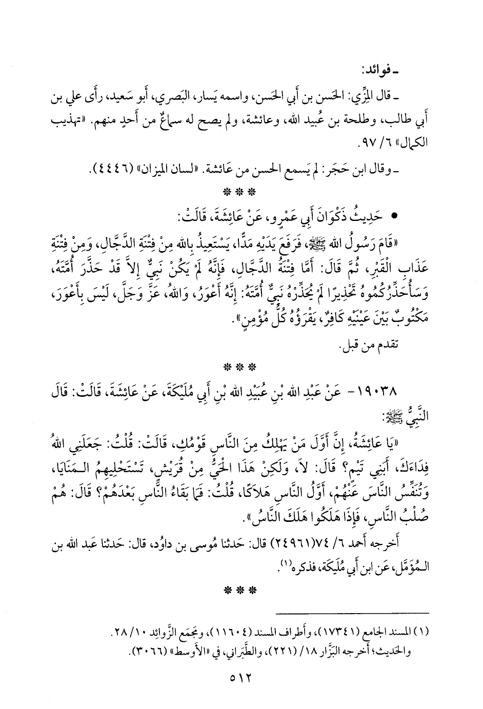 - وقال ابن حَجر: لم يسمع الحسن من عائشة. «لسان الميزان» (٤٤٤٦).