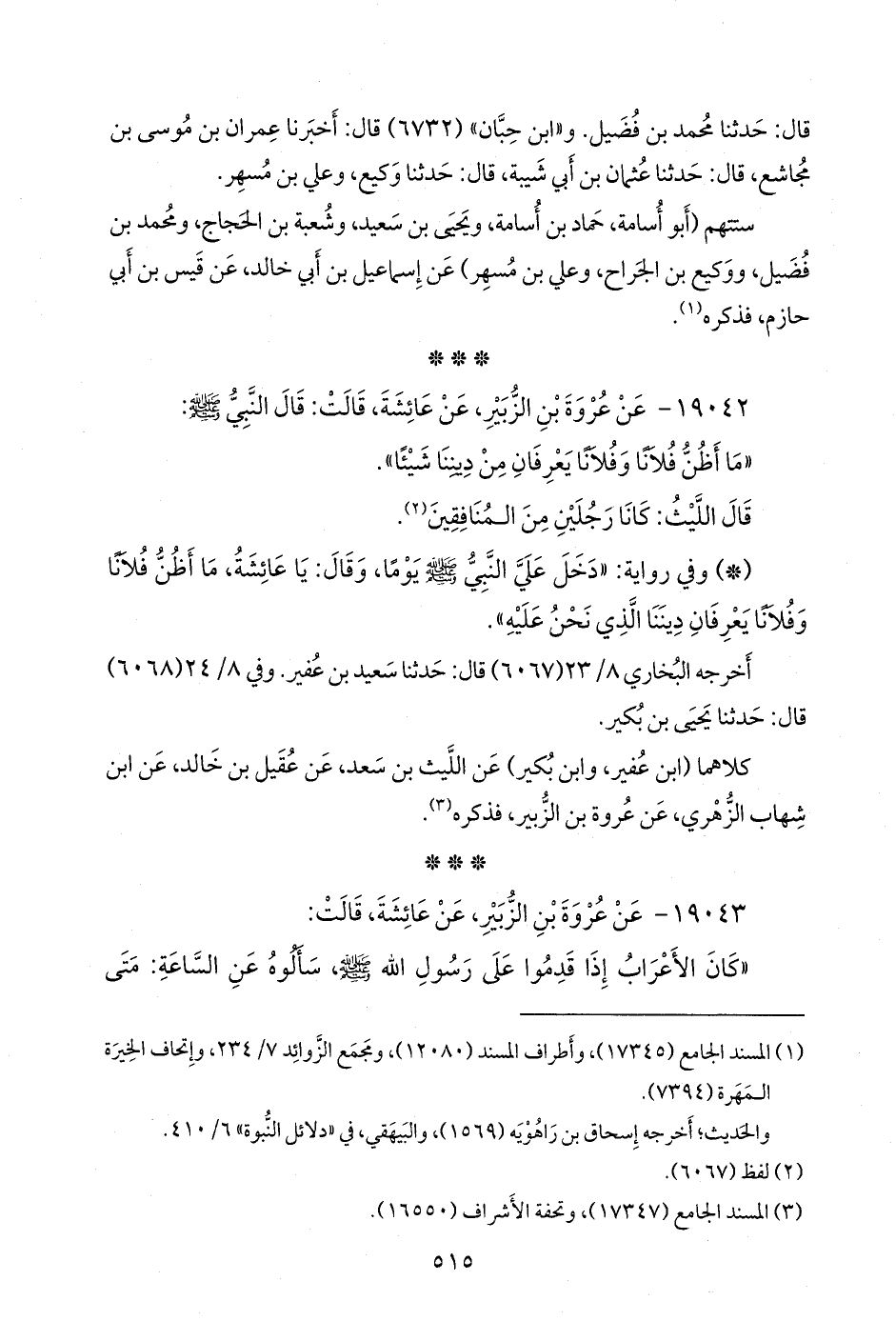 ١٩٠٤٣ - عن عروة بن الزبير، عن عائشة، قالت: