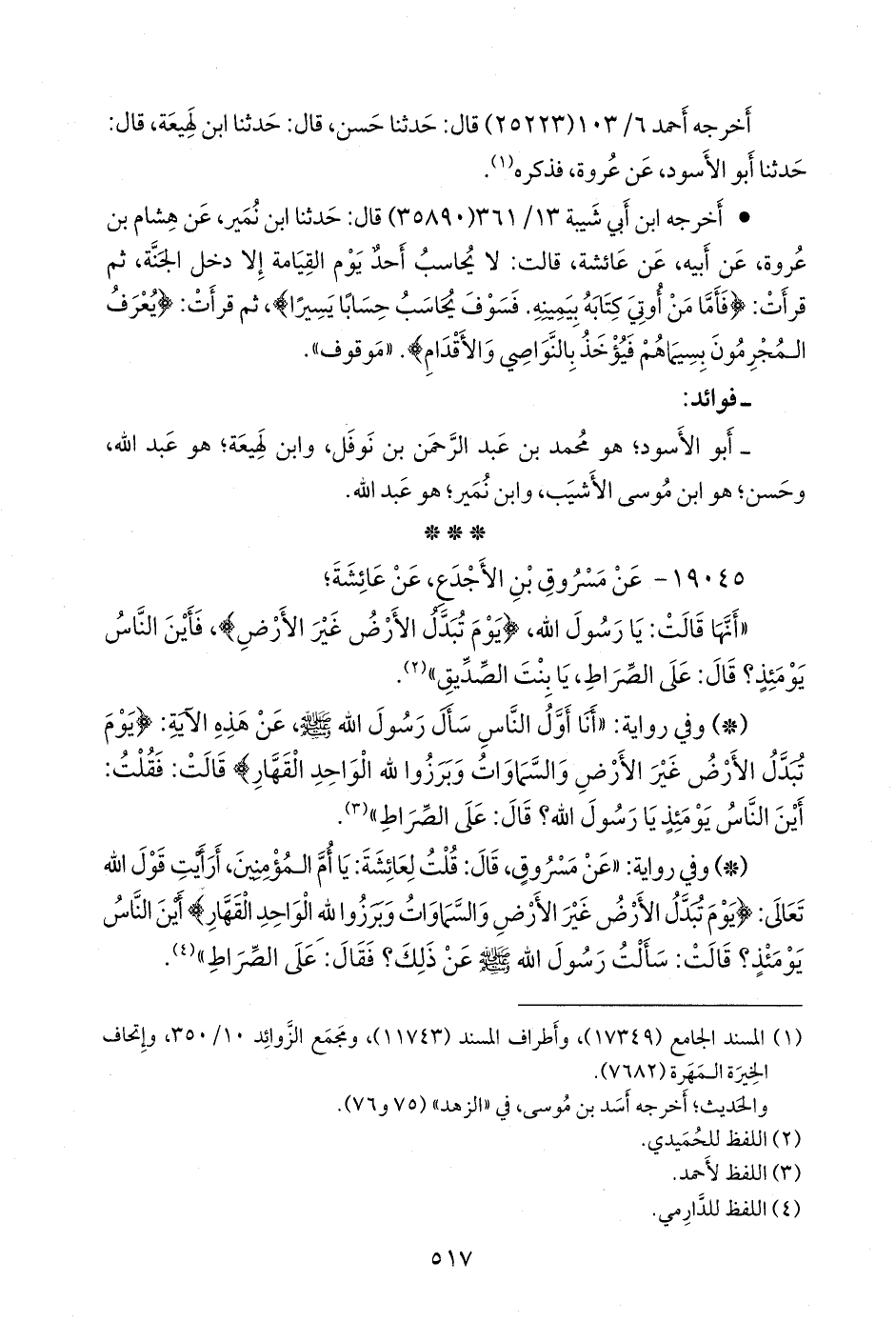 - وفي رواية: «عن مسروق، قال: قلت لعائشة: يا أُم المؤمنين، أرأيت قول الله تعالى: {يوم تبدل الأرض غير الأرض والسماوات وبرزوا لله الواحد القهار} أين الناس يومئذ؟ قالت: سألت رسول الله صَلى الله عَليه وسَلم عن ذلك؟ فقال: على الصراط» (¬٣).