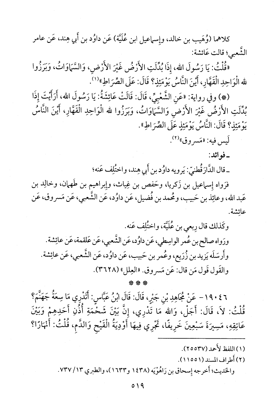فرواه إسماعيل بن زكريا، وحفص بن غياث، وإبراهيم بن طهمان، وخالد بن عبد الله، وعائذ بن حبيب، ومحمد بن فضيل، عن داود، عن الشعبي، عن مسروق، عن عائشة.