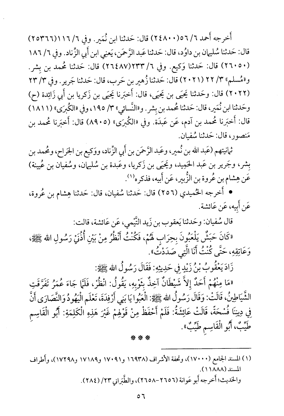 • أَخرجه الحُميدي (٢٥٦) قال: حدثنا سفيان، قال: حدثنا هشام بن عروة، عن أبيه، عن عائشة.