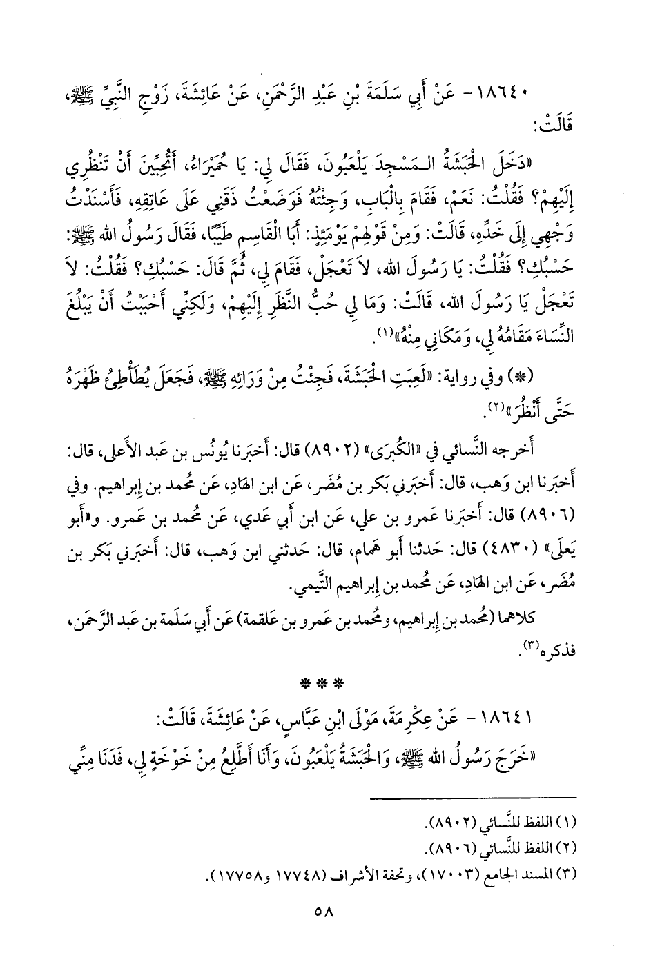 «دخل الحبشة المسجد يلعبون، فقال لي: يا حميراء، أتحبين أن تنظري إليهم؟ فقلت: نعم، فقام بالباب، وجئته فوضعت ذقني على عاتقه، فأسندت وجهي إلى خده، قالت: ومن قولهم يومئذ: أبا القاسم طيبا، فقال رسول الله صَلى الله عَليه وسَلم: حسبك؟ فقلت: يا رسول الله، لا تعجل، فقام لي، ثم قال: حسبك؟ فقلت: لا تعجل يا رسول الله، قالت: وما لي حب النظر إليهم، ولكني أحببت أن يبلغ النساء مقامه لي، ومكاني منه» (¬١).
