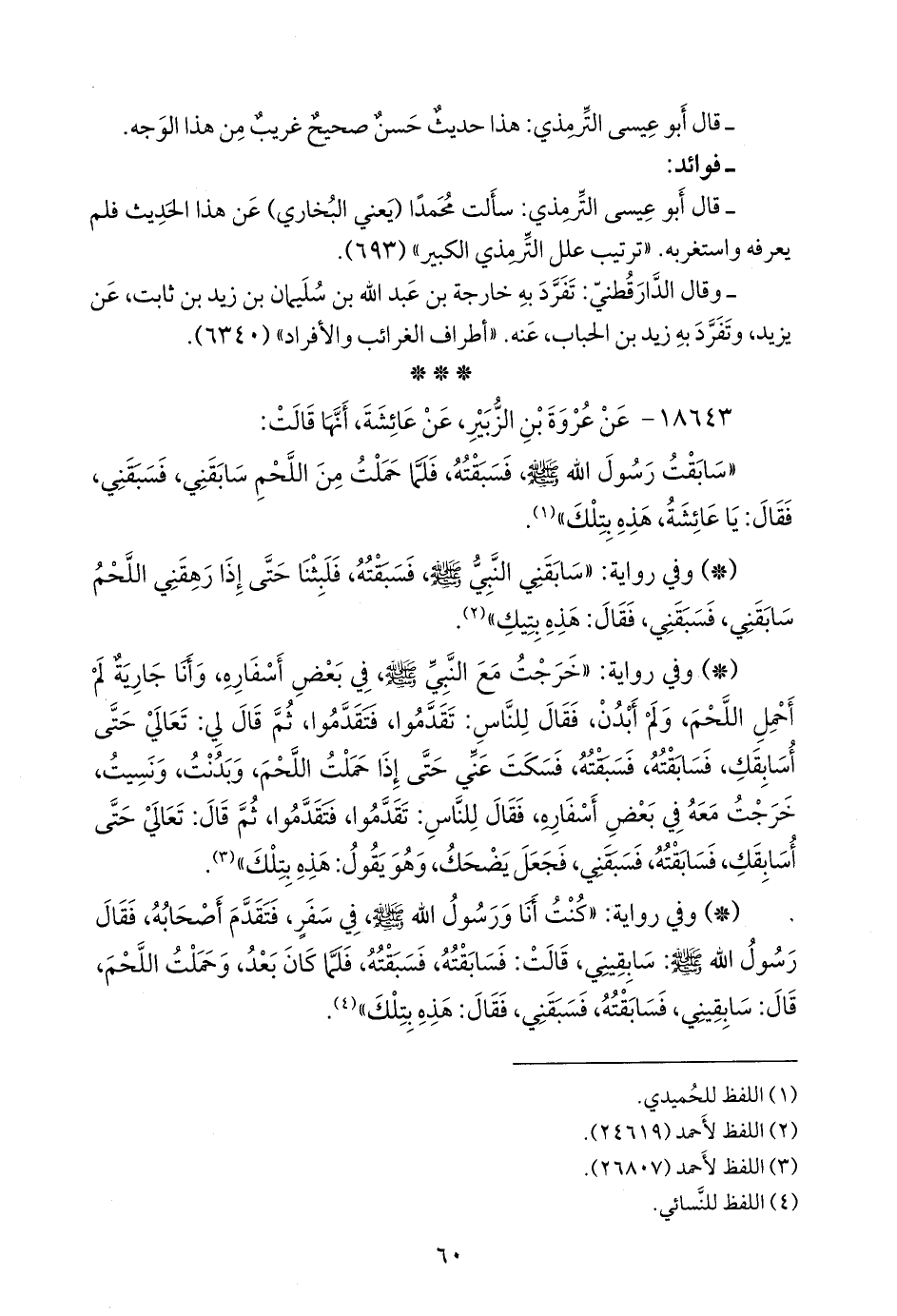 - وفي رواية: «كنت أنا ورسول الله صَلى الله عَليه وسَلم في سفر، فتقدم أصحابه، فقال رسول الله صَلى الله عَليه وسَلم: سابقيني، قالت: فسابقته، فسبقته، فلما كان بعد، وحملت اللحم، قال: سابقيني، فسابقته، فسبقني، فقال: هذه بتلك» (¬٤).