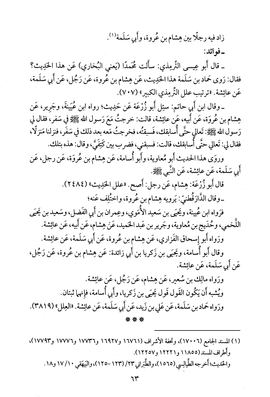- قال التِّرمِذي: سألتُ محمدًا، يعني ابن إسماعيل البخاري، عن هذا الحديث؟ فقال: روى حماد بن سلمة هذا الحديث، عن هشام بن عروة، عن رجل، عن أبي سلمة، عن عائشة. «ترتيب علل التِّرمِذي الكبير» (٧٠٧).
