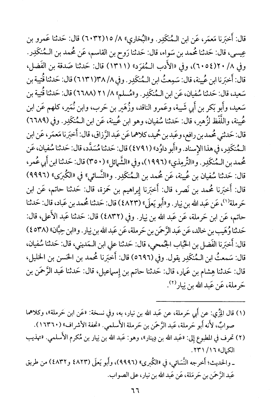 و «البخاري» ٨/ ١٥ (٦٠٣٢) قال: حدثنا عَمرو بن عيسى, قال: حدثنا محمد بن سواء, قال: حدثنا روح بن القاسم، عن محمد بن المُنكدِر. وفي ٨/ ٢٠ (٦٠٥٤)، وفي «الأدب المفرد» (١٣١١) قال: حدثنا صدقة بن الفضل, قال: أخبرنا ابن عُيينة، قال: سمعت ابن المُنكدِر. وفي ٨/ ٣٨ (٦١٣١) قال: حدثنا قتيبة بن سعيد, قال: حدثنا سفيان، عن ابن المُنكدِر. و «مسلم» ٨/ ٢١ (٦٦٨٨) قال: حدثنا قتيبة بن سعيد، وأَبو بكر بن أبي شيبة، وعَمرو الناقد، وزهير بن حرب، وابن نُمير، كلهم عن ابن عُيينة، واللفظ لزهير، قال: حدثنا سفيان، وهو ابن عُيينة، عن ابن المُنكدِر. وفي (٦٦٨٩) قال: حدثني محمد بن رافع، وعَبد بن حُميد، كلاهما عن عبد الرزاق, قال: أخبرنا معمر، عن ابن المُنكدِر، في هذا الإسناد. و «أَبو داود» (٤٧٩١) قال: حدثنا مُسدد, قال: حدثنا سفيان، عن محمد بن المُنكدِر. و «التِّرمِذي» (١٩٩٦)، وفي «الشمائل» (٣٥٠) قال: حدثنا ابن أبي عمر, قال: حدثنا سفيان بن عُيينة، عن محمد بن المُنكدِر. و «النَّسَائي» في «الكبرى» (٩٩٩٦) قال: أخبرنا محمد بن نصر, قال: أخبرنا إبراهيم بن حمزة, قال: حدثنا حاتم، عن ابن حَرملة (¬١)، عن عبد الله بن نيار. و «أَبو يَعلى» (٤٨٢٣) قال: حدثنا محمد بن عباد، قال: حدثنا حاتم، عن ابن حَرملة، عن عبد الله بن نيار. وفي (٤٨٣٢) قال: حدثنا عبد الأعلى، قال: حدثنا وهيب بن خالد، عن عبد الرَّحمَن بن حَرملة، عن عبد الله بن نيار. و «ابن حِبَّان» (٤٥٣٨) قال: أخبرنا الفضل بن الحُبَاب الجُمحي، قال: حدثنا علي بن المديني، قال: حدثنا سفيان، قال: سمعت ابن المُنكدِر يقول.