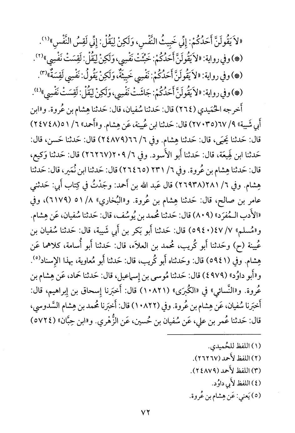 وفي ٦/ ٦٦ (٢٤٨٧٩) قال: حدثنا حسن, قال: حدثنا ابن لَهِيعة, قال: حدثنا أَبو الأسود. وفي ٦/ ٢٠٩ (٢٦٢٦٧) قال: حدثنا وكيع، قال: حدثنا هشام بن عروة. وفي ٦/ ٢٣١ (٢٦٤٦٥) قال: حدثنا ابن نُمير، قال: حدثنا هشام. وفي ٦/ ٢٨١ (٢٦٩٣٨) قال عبد الله بن أحمد: وجدت في كتاب أبي: حدثني عامر بن صالح، قال: حدثنا هشام بن عروة. و «البخاري» ٨/ ٥١ (٦١٧٩)، وفي «الأدب المفرد» (٨٠٩) قال: حدثنا محمد بن يوسف, قال: حدثنا سفيان، عن هشام. و «مسلم» ٧/ ٤٧ (٥٩٤٠) قال: حدثنا أَبو بكر بن أبي شيبة, قال: حدثنا سفيان بن عُيينة (ح) وحدثنا أَبو كُريب محمد بن العلاء, قال: حدثنا أَبو أسامة، كلاهما عن هشام. وفي (٥٩٤١) قال: وحدثناه أَبو كُريب, قال: حدثنا أَبو معاوية، بهذا الإسناد (¬١). و «أَبو داود» (٤٩٧٩) قال: حدثنا موسى بن إسماعيل, قال: حدثنا حماد، عن هشام بن عروة. و «النَّسَائي» في «الكبرى» (١٠٨٢١) قال: أخبرنا إسحاق بن إبراهيم, قال: أخبرنا سفيان، عن هشام بن عروة. وفي (١٠٨٢٢) قال: أخبرنا محمد بن هشام السدوسي, قال: حدثنا عمر بن علي، عن سفيان بن حسين، عن الزُّهْري.
