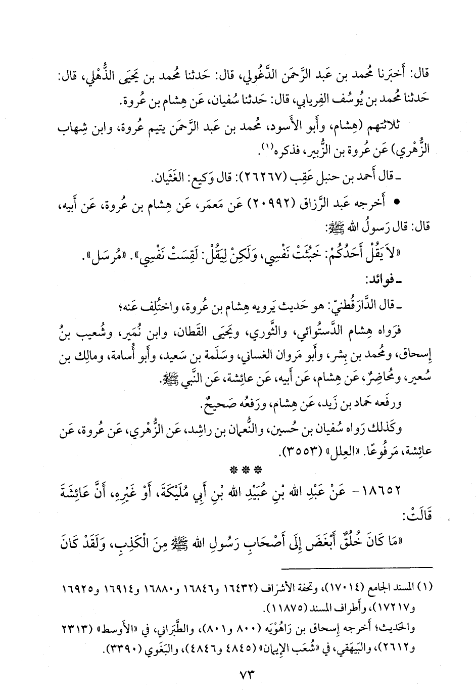 فرواه هشام الدَّستوائي، والثوري، ويحيى القطان، وابن نُمير، وشعيب بن إسحاق، ومحمد بن بشر، وأَبو مروان الغساني، وسلمة بن سعيد، وأَبو أسامة، ومالك بن سعير، ومحاضر، عن هشام، عن أبيه، عن عائشة، عن النبي صَلى الله عَليه وسَلم.