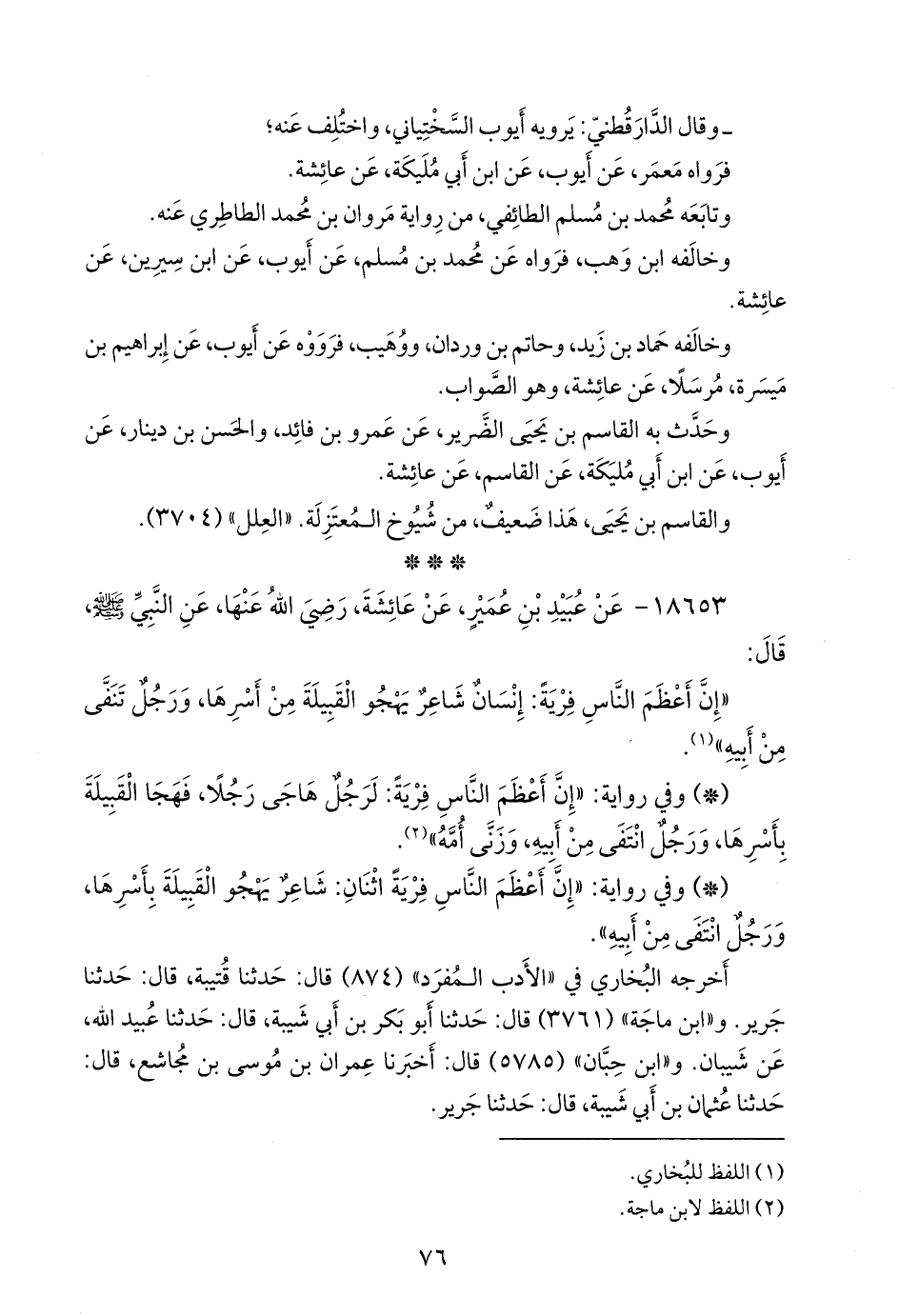 - وفي رواية: «إن أعظم الناس فرية اثنان: شاعر يهجو القبيلة بأسرها، ورجل انتفى من أبيه».