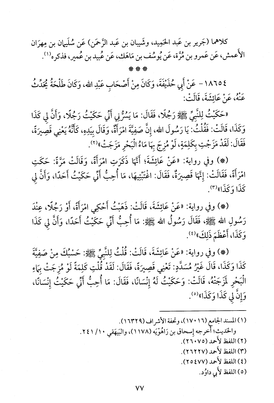 - وفي رواية: «عن عائشة، قالت: قلت للنبي صَلى الله عَليه وسَلم: حسبك من صفية كذا وكذا، قال غير مُسدد: تعني قصيرة، فقال: لقد قلت كلمة لو مزجت بماء البحر لمزجته، قالت: وحكيت له إنسانا، فقال: ما أحب أني حكيت إنسانا، وإن لي كذا وكذا» (¬٤).