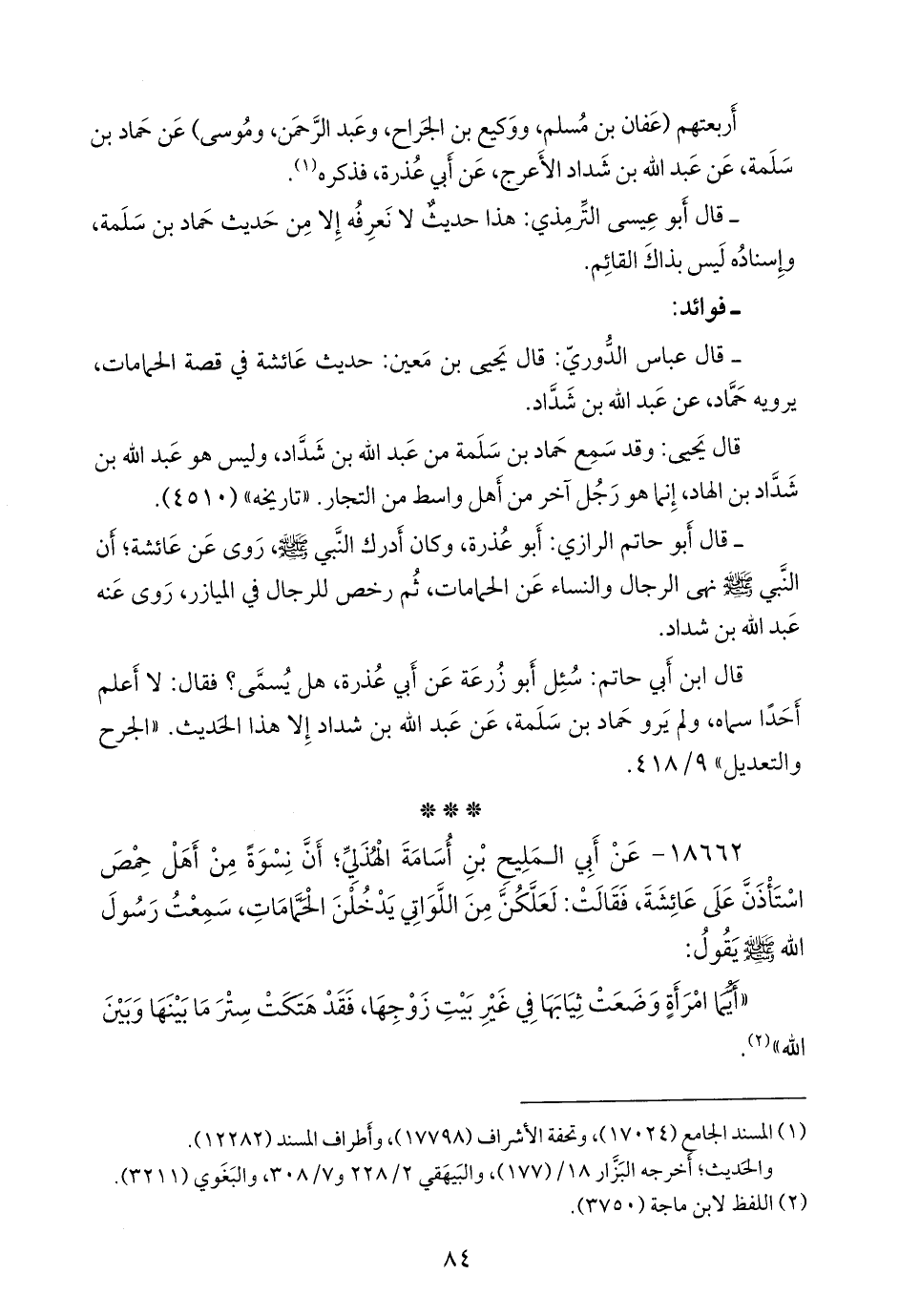 - قلنا: إسناده ضعيفٌ؛ قال عباس الدُّوري: قال يَحيى بن مَعين: حديث عائشة في قصة الحمامات، يرويه حماد، عن عبد الله بن شداد.