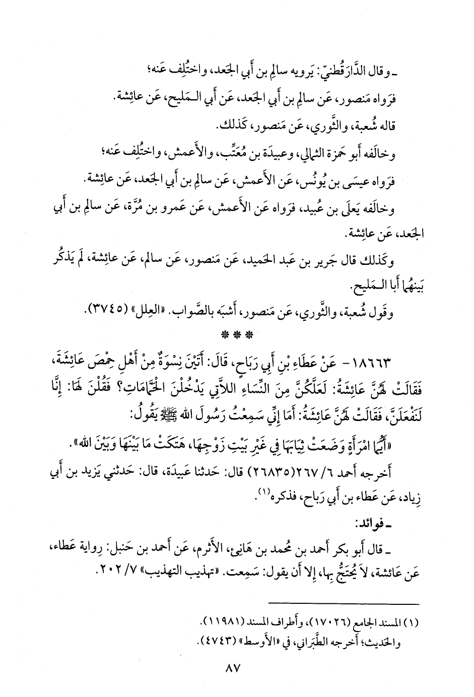 - قلنا: إِسناده ضعيفٌ؛ قال أَبو بكر أحمد بن محمد بن هانئ، الأثرم، عن أحمد بن حنبل: رواية عطاء، عن عائشة، لا يحتج بها، إلا أن يقول: سمعت. «تهذيب التهذيب» ٧/ ٢٠٢.