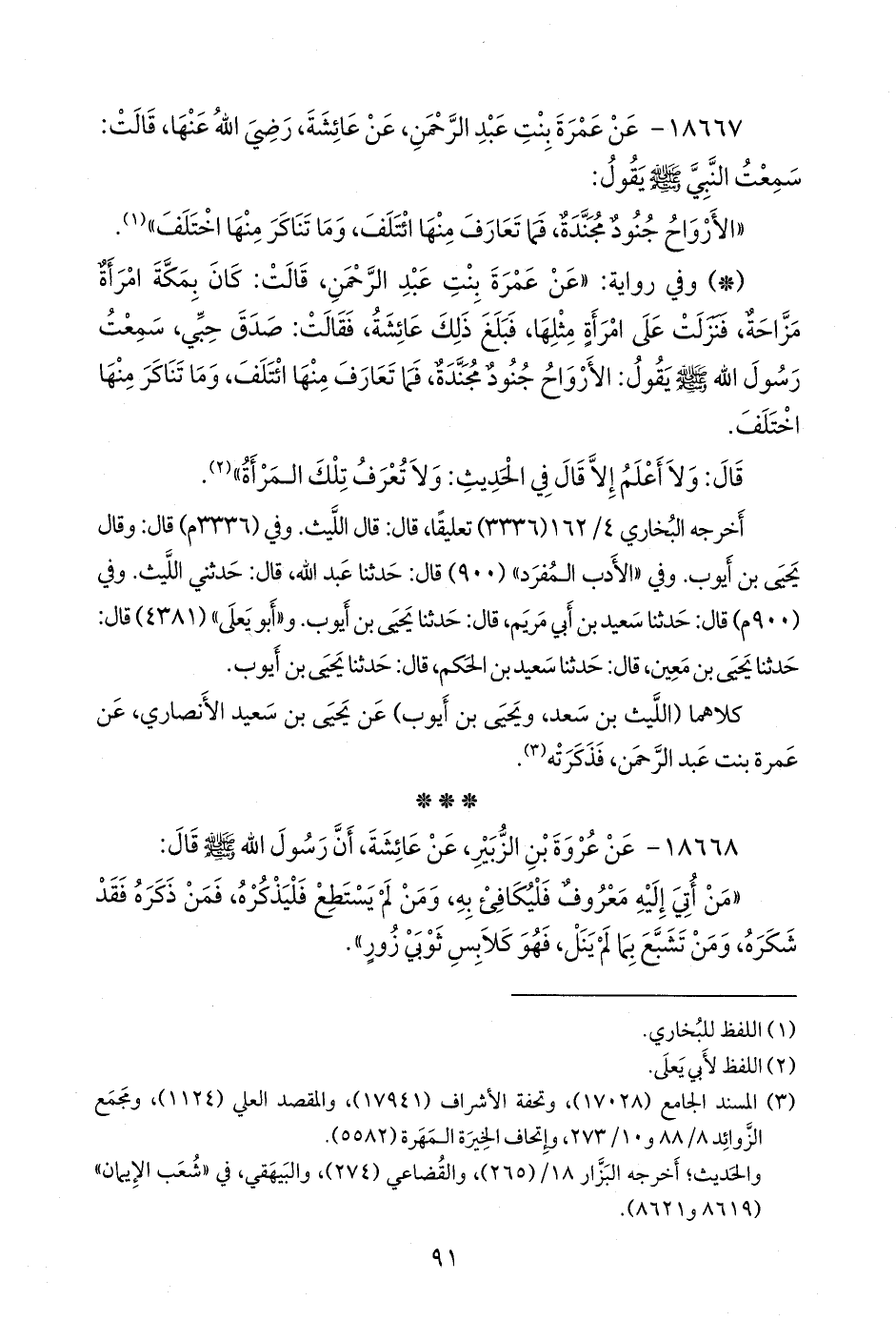 - وفي رواية: «عن عَمرَة بنت عبد الرَّحمَن، قالت: كان بمكة امرأة مزاحة، فنزلت على امرأة شبهًا لها، فبلغ ذلك عائشة، فقالت: صدق حبي، سمعت رسول الله صَلى الله عَليه وسَلم يقول: الأرواح جنود مجندة، فما تعارف منها ائتلف، وما تناكر منها اختلف.