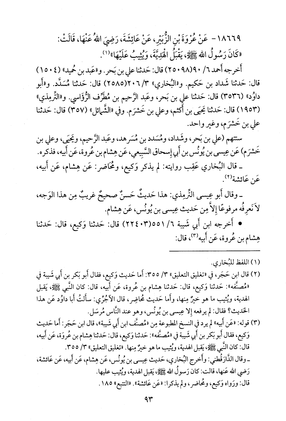 (¬٣) قوله: «عن أبيه» لم يرد في النسخ المطبوعة من «مصنف ابن أبي شيبة»، قال ابن حجر: أما حديث وكيع، فقال أَبو بكر بن أبي شيبة في «مصنفه»: حدثنا وكيع، قال: حدثنا هشام بن عروة، عن أبيه، قال: كان النبي صَلى الله عَليه وسَلم يقبل الهدية، ويثيب ما هو خير منها. «تغليق التعليق» ٣/ ٣٥٥.