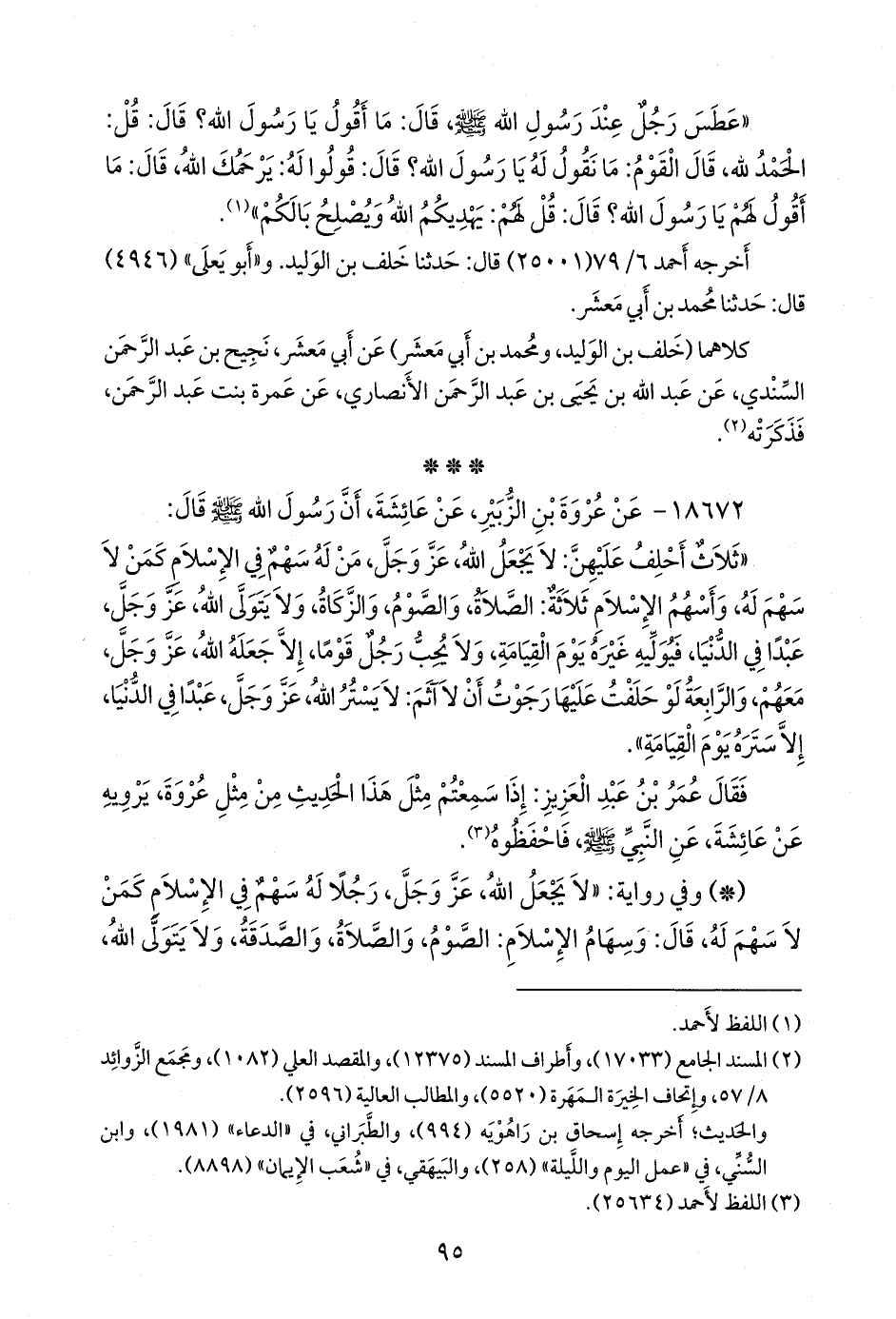 - وفي رواية: «لا يجعل الله، عز وجل، رجلا له سهم في الإسلام كمن لا سهم له، قال: وسهام الإسلام: الصوم، والصلاة، والصدقة، ولا يتولى الله،