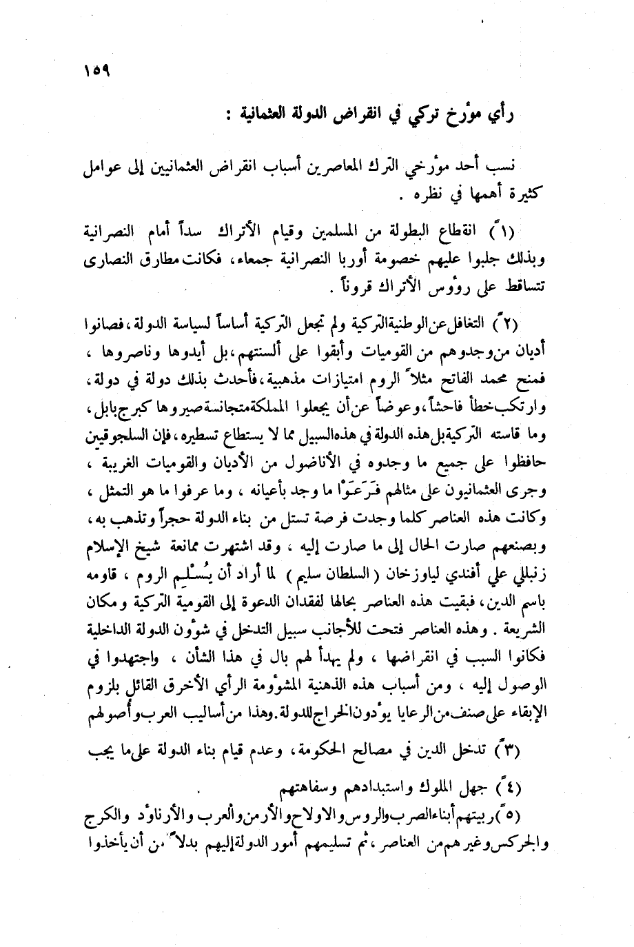 ومكان الشريعة. وهذه العناصر فتحت للأجانب سبيل التدخل في شؤون الدولة الداخلية فكانوا السبب في انقراضها، ولم يهدأ لهم بال في هذا الشأن، واجتهدوا في الوصول إليه، ومن أسباب هذه الذهنية المشؤومة الرأي الأخرق القائل بلزوم الإبقاء على صنف من الرعايا يؤدون الخراج للدولة. وهذا من أساليب العرب وأصولهم