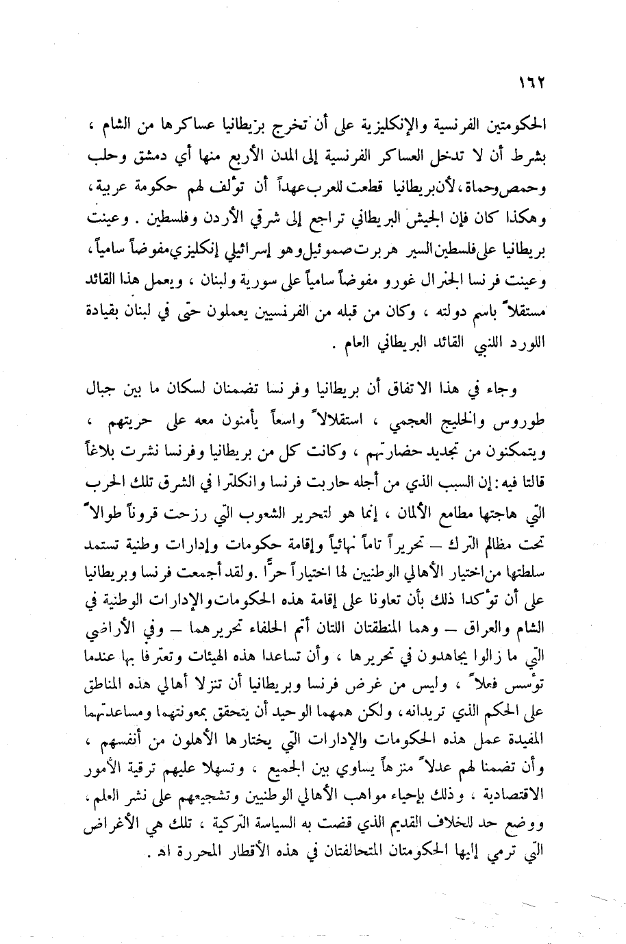 وجاء في هذا الاتفاق أن بريطانيا وفرنسا تضمنان لسكان ما بين جبال طوروس والخليج العجمي، استقلالاً واسعاً يأمنون معه على حريتهم، ويتمكنون من تجديد حضارتهم، وكانت كل من بريطانيا وفرنسا نشرت بلاغاً قالتا فيه: إن السبب الذي من أجله حاربت فرنسا وانكلترا في الشرق تلك الحرب التي هاجتها مطامع الألمان، إنما هو لتحرير الشعوب التي رزحت قروناً طوالاً تحت مظالم الترك - تحريراً تاماً نهائياً وإقامة حكومات وإدارات وطنية تستمد سلطتها من اختيار الأهالي الوطنيين لها اختياراً حرًّا. ولقد أجمعت فرنسا وبريطانيا على أن تؤكد ذلك بأن تعاونا على إقامة هذه الحكومات والإدارات الوطنية في الشام والعراق - وهما المنطقتان اللتان أتم الحلفاء تحريرهما وفي الأراضي التي ما زالوا يجاهدون في تحريرها، وأن تساعدا هذه الهيئات وتعترفا بها عندما تؤسس فعلاً، وليس من غرض فرنسا وبريطانيا أن تنزلا أهالي هذه المناطق على الحكم الذي تريدانه، ولكن همهما الوحيد أن يتحقق بمعونتهما ومساعدتهما المفيدة عمل هذه الحكومات والإدارات التي يختارها الأهلون من أنفسهم، وأن تضمنا لهم عدلاً منزهاً يساوي بين الجميع، وتسهلا عليهم ترقية الأمور الاقتصادية، وذلك بإحياء مواهب الأهالي الوطنيين وتشجيعهم على نشر العلم، ووضع حد للخلاف القديم الذي قضت به السياسة التركية، تبك هي الأغراض التي ترمي إليها الحكومتان المتحالفتان في هذه الأقطار المحررة اه.