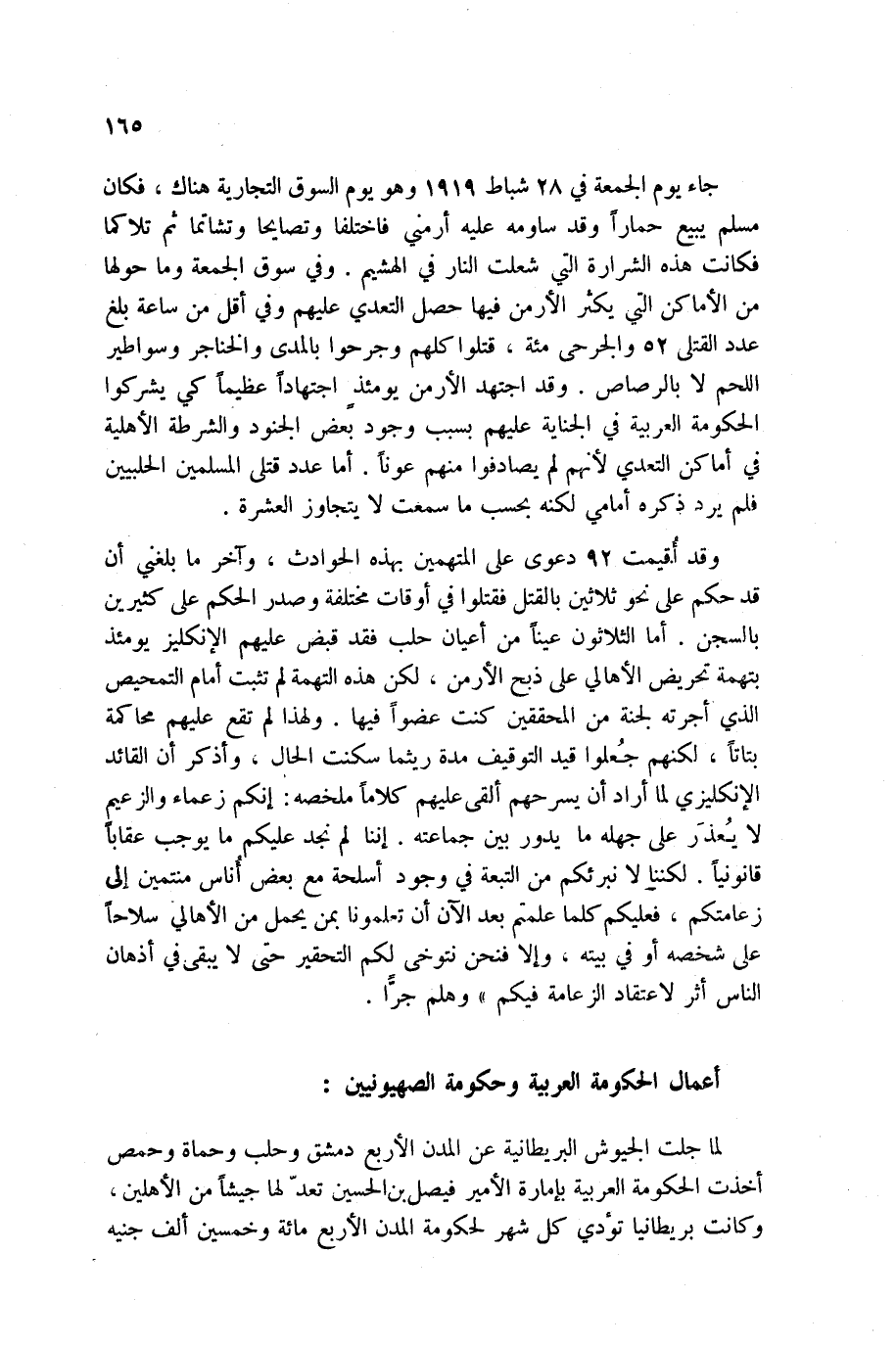 وقد أُقيمت 92 دعوى على المتهمين بهذه الحوادث، وآخر ما بلغني أن قد حكم على نحو ثلاثين بالقتل فقتلوا في أوقات مختلفة وصدر الحكم على كثيرين بالسجن. أما الثلاثون عيناً من أعيان حلب فقد قبض عليهم الإنكليز يومئذ بتهمة تحريض الأهالي على ذبح الأرمن، لكن هذه التهمة لم تثبت أمام التمحيص الذي أجرته لجنة من المحققين كنت عضواً فيها. ولهذا لم تقع عليهم محاكمة بتاتاً، لكنهم جُعلوا قيد التوقيف مدة ريثما سكنت الحال، وأذكر أن القائد الإنكليزي لما