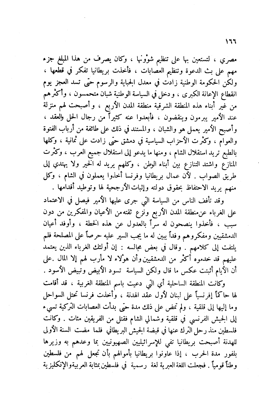 مصري، لتستعين بها على تنظيم شؤونها، وكان يصرف من هذا المبلغ جزء مهم على بث الدعوة وتنظيم العصابات، فأخذت بريطانيا تفكر في قطعها، ولكن الحكومة الوطنية زادت في معدل الجباية والرسوم حتى تسد العجز يوم انقطاع الإعانة الكبرى، ودخل في السياسة الوطنية شبان متحمسون، وأكثرهم من غير أبناء هذه المنطقة الشرقية منطقة المدن الأربع، وأصبحت لهم منزلة عند الأمير يبرمون وينقضون، فأبعدوا عنه كثيراً من رجال الحل والعقد، وأصبح الأمير يعمل هو والشبان، والمستند في ذلك على طائفة من أرباب الفتوة والعوام، وكثرت الأحزاب السياسية في دمشق حتى زادت على ثمانية، وكلها بالطبع تريد استقلال الشام، ومنها ما يدعو إلى استقلال جميع العرب، وكثرت المنازع واشتد التنازع بين أبناء الوطن، وكلهم يريد له الخير ولا يهتدي إلى طريق الصواب. لأن عمال بريطانيا وفرنسا أخذوا يعملون في الشام، وكل منهم يريد الاحتفاظ بحقوق دولته وثبات الأرجحية لها وتوطيد أقدامها.