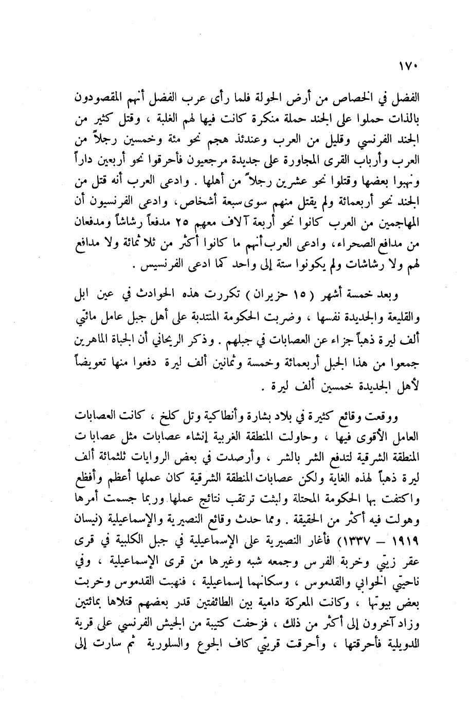 لهذه الغاية ولكن عصابات المنطقة الشرقية كان عملها أعظم وأفظع واكتفت بها الحكومة المحتلة ولبثت ترتقب نتائج عملها وربما جسمت أمرها وهولت فيه أكثر من الحقيقة. ومما حدق وقائع النصيرية على الإسماعيلية في جبل الكلبية في قرى عقر زيتي وخربة الفرس وجمعه شبه وغيرها من قرى الإسماعيلية، وفي ناحيتي الخوابي والقدموس، وسكانهما إسماعيلية، فنهبت القدموس وخربت بعض بيوتها، وكانت المعركة دامية بين الطائفتين قدر بعضهم قتلاها بمائتين وزاد آخرون إلى أكثر من ذلك، فزحفت كتيبة من الجيش الفرنسي على قرية الدويلية فأحرقتها، وأحرقت قريتي كاف الجوع والسلورية ثم سارت إلى