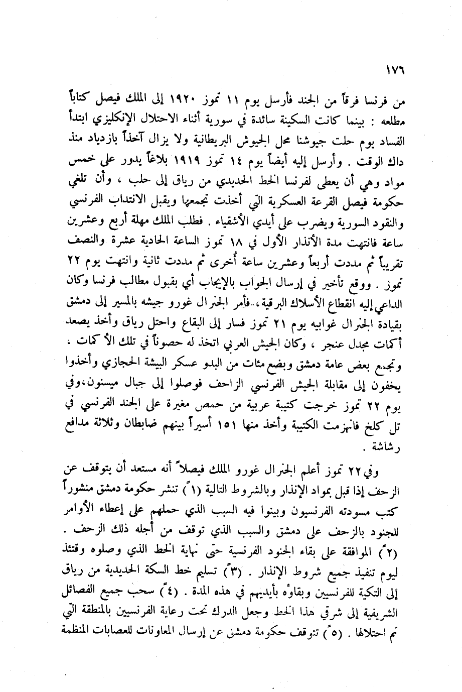 الإنذار. 3ً تسليم خط السكة الحديدية من رياق إلى التكية للفرنسيين وبقاؤه بأيديهم في هذه المدة. 4ً سحب جميع الفصائل الشريفية إلى شرقي هذا الخط وجعل الدرك تحت رعاية الفرنسيين بالمنطقة التي تم احتلالها. 5ً تتوقف حكومة دمشق عن إرسال المعاونات للعصابات المنظمة
