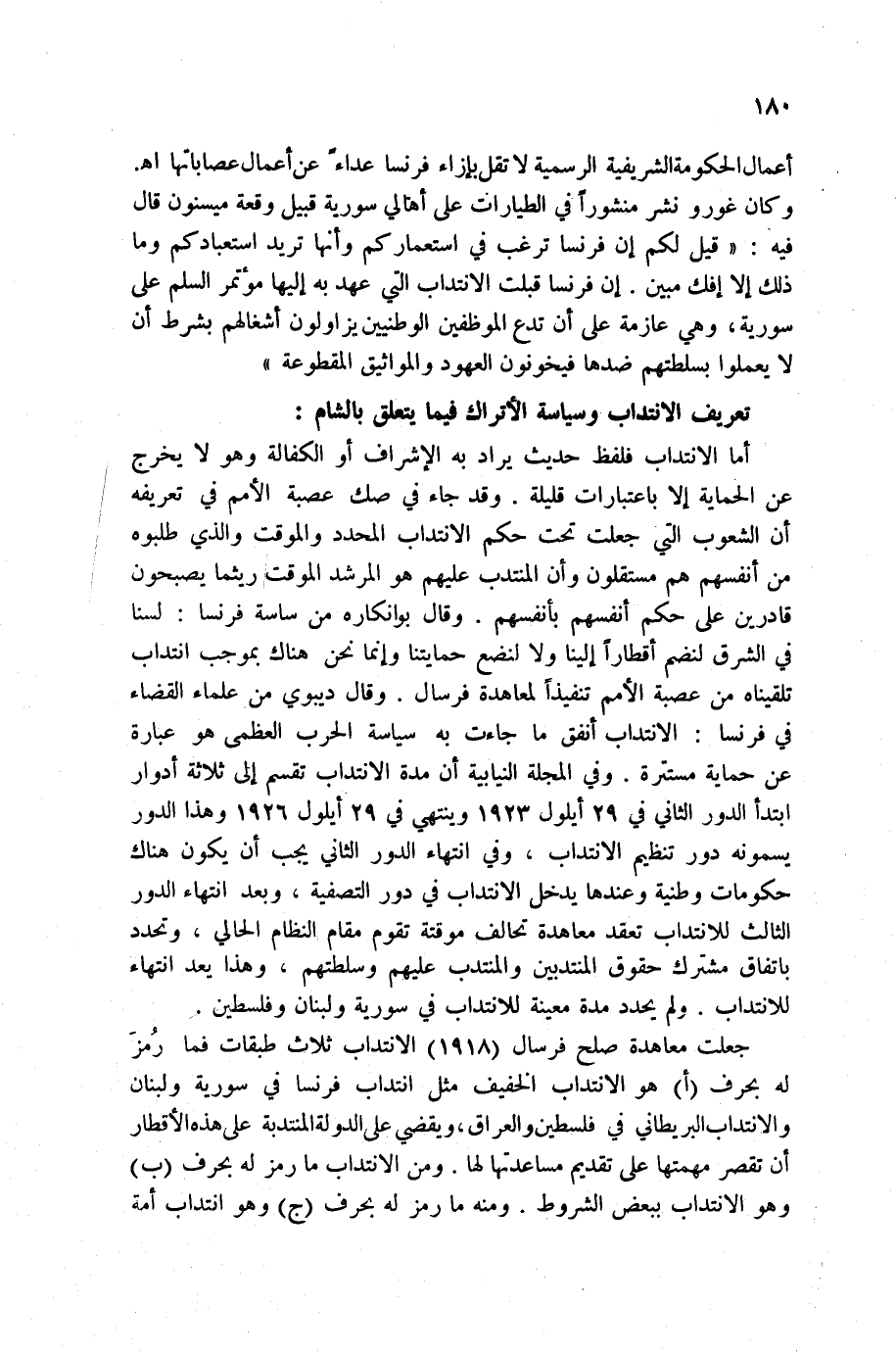 أما الانتداب فلفظ حديث يراد به الإشراف أو الكفالة وهو لا يخرج عن الحماية إلا باعتبارات قليلة. وقد جاء في صك عصبة الأمم في تعريفه أن الشعوب التي جعلت تحت حكم الانتداب المحدد والموقت والذي طلبوه من أنفسهم هم مستقلون وأن المنتدب عليهم هو المرشد الموقت ريثما يصبحون قادرين على حكم أنفسهم. وقال بوانكاره من ساسة فرنسا: لسنا في الشرق لنضم أقطاراً إلينا ولا لنضع حمايتنا وإنما نحن هناك بموجب انتداب تلقيناه من عصبة الأمم تنفيذاً لمعاهدة فرسال. وقال ديبوي من علماء القضاء في فرنسا: الانتداب أنفق ما جاءت به سياسة الحرب العظمى هو عبارة عن حماية مستترة. وفي المجلة النيابية ن مدة الانتداب تقسم إلى ثلاثة أدوار ابتدأ الدور الثاني في 29 أيلول 1926 وهذا الدور يسمونه دور تنظيم الانتداب، وفي انتهاء الدور الثاني يجب أن يكون هناك حكومات وطنية وعندها يدخل الانتداب في دور التصفية، وبعد انتهاء الدور الثالث للانتداب تعقد معاهدة تحالف مؤقتة تقوم مقام النظام الحالي، وتحدد باتفاق مشترك حقوق المنتدبين والمنتدب عليهم وسلطتهم، وهذا يعد انتهاء للانتداب. ولم يحدد مدة معينة للانتداب في سورية ولبنان وفلسطين.