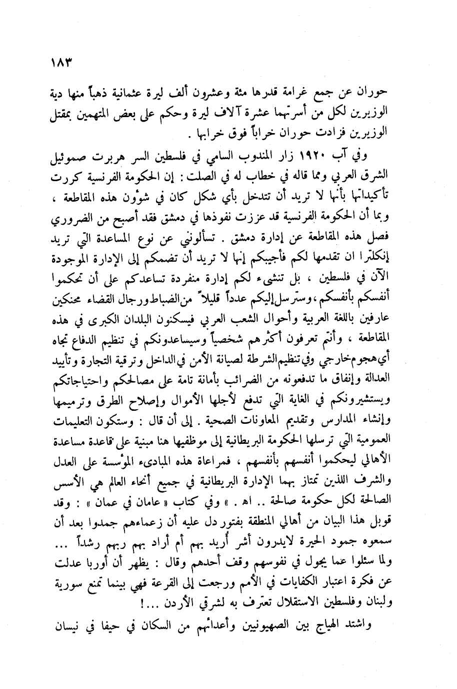 الصحية. إلى أن قال: وستكون التعليمات العمومية التي ترسلها الحكومة البريطانية إلى موظفيها هنا مبنية على قاعدة مساعدة الأهالي ليحكموا أنفسهم بأنفسهم، فمراعاة هذه المبادئ المؤسسة على العدل والشرف اللذين تمتاز بهما الإدارة البريطانية في جميع أنحاء العالم هي الأسس الصالحة لكل حكومة صالحة. . اه. وفي كتاب عامان في عمان: وقد قوبل هذا البيان من أهالي المنطقة بفتور دل عليه أن زعماءهم جمدوا بعد أن سمعوه جمود الحيرة لا يدرون أشر أُريد بهم أم أراد بهم ربهم رشداً. . . ولما سئلوا عما يجول في نفوسهم وقف أحدهم وقال: يظهر أن أوربا عدلت عن فكرة اعتبار الكفايات في الأمم ورجعت إلى القرعة فهي بينما تمنع سورية ولبنان وفلسطين الاستقلال تعترف به لشرقي الأردن. . .!