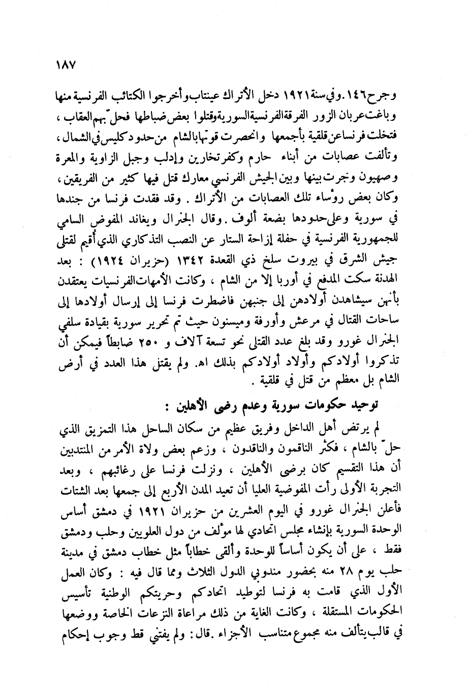 وجرح 146. وفي سنة 1921 دخل الأتراك عينتاب وأخرجوا الكتائب الفرنسية منها وباغت عربان الزور الفرقة الفرنسية السورية وقتلوا بعض ضباطها فحلّ بهم العقاب، فتخلت فرنسا عن قلقية بأجمعها وانحصرت قوتها بالشام من حدود كليس في الشمال، وتألفت عصابات من أبناء حارم وكفر تخارين وإدلب وجبل الزاوية والمعرة وصهيون وجرت بينها وبين الجيش الفرنسي معارك قتل فيها كثير من الفريقين، وكان بعض رؤساء تلك العصابات من الأتراك. وقد فقدت فرنسا من جندها في سورية وعلى حدودها بضعة ألوف. وقال الجنرال ويغاند المفوض السامي للجمهورية الفرنسية في حفلة إزاحة الستار عن النصب التذكاري الذي أُقيم لقتلى جيش الشرق في بيروت سلخ ذي القعدة 1342 حزيران 1924: بعد الهدنة سكت المدفع في أوربا إلا من الشام، وكانت الأمهات الفرنسيات يعتقدن بأنهن سيشاهدن أولادهن إلى جنبهن فاضطرت فرنسا إلى إرسال أولادها إلى ساحات القتال في مرعش وأورفة وميسنون حيث تم تحرير سورية بقيادة سلفي الجنرال غورو وقد بلغ عدد القتلى نحو تسعة آلاف و 250 ضابطاً فيمكن أن تذكروا أولادكم وأولاد أولادكم بذلك اه. ولم يقتل هذا العدد في أرض الشام بل معظم من قتل في قلقية.