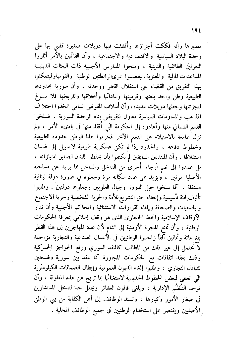 مصيرها وأنه فككت أجزاؤها وأنشئت فيها دويلات صغيرة قضي بها على وحدة البلاد السياسية والاقتصادية والاجتماعية، وأن القائمين بالأمر أثاروا النعرتين الطائفية والدينية، ومنحوا المدارس الأجنبية ذات البعثات الدينية المساعدات المالية والمعنوية، ليفصموا عرى الرابطتين الوطنية والقومية وليتمكنوا بهذا التفريق من القضاء على استقلال القطر ووحدته، وأن سورية بحدودها الطبيعية وطن واحد بلغتها وقوميتها وعاداتها وأخلاقها وتاريخها فلا مسوغ لتجزئتها وجعلها دويلات عديدة، وأن أسلاف المفوض السامي اتخذوا اختلاف المذاهب والمساومات السياسية معاول لتقويض بناء الوحد السورية، فسلخوا القسم الشمالي منها وأعادوه إلى الحكومة التي أُ نقذ منها في بادئ الأمر، ولم تزل طامعة بالاستيلاء على القسم آخر فحرموا هذا الوطن حدوده الطبيعية وخطوط دفاعه، والحدود إذا لم تكن عسكرية طبيعية لا سبيل إلى ضمان استقلالها. وأن المنتدبين السابقين لم يكتفوا بأن يحفظوا للبنان الصغير امتيازاته، بل عمدوا إلى ضم أرجاء أخرى من الداخل والساحل مما يزيد عن مساحته الأصلية مرتين، ويزيد على عدد سكانه مرة وجعلوه في صورة دولة لبنانية مستقلة، كما سلخوا جبل الدروز وجبال العلويين