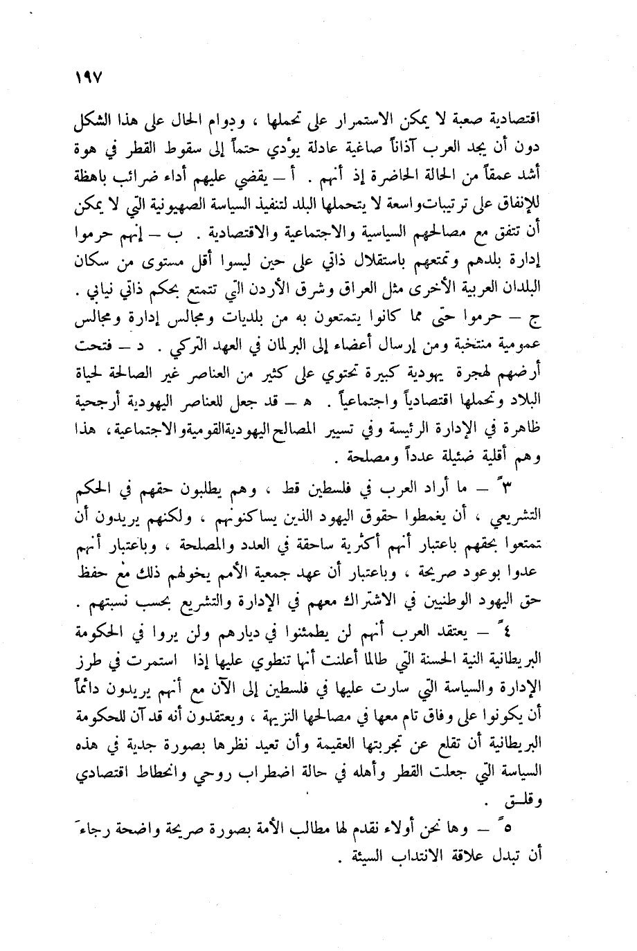 اقتصادية صعبة لا يمكن الاستمرار على تحملها، ودوام الحال على هذا الشكل دون أن يجد العرب آذاناً صاغية عادلة يؤدي حتماً إلى سقوط القطر في هوة أشد عمقاً من الحالة الحاضرة إذ أنهم. أ - يقضي عليهم أداء ضرائب باهظة للإنفاق على ترتيبات واسعة لا يتحملها البلد لتنفيذ السياسة الصهيونية التي لا يمكن أن تتفق مع مصالحهم السياسية والاجتماعية والاقتصادية. ب - إنهم حرموا إدارة بلدهم وتمتعهم باستقلال ذاتي على حين ليسوا أقل مستوى من سكان البلدان العربية الأخرى مثل العراق وشرق الأردن التي تتمتع بحكم ذاتي نيابي. ج - حرموا حتى مما كانوا يتمتعون به من بلديات ومجالس إدارة ومجالس عمومية منتخبة ومن إرسال أعضاء إلى البرلمان في العهد التركي. د - فتحت أرضهم لهجرة يهودية كبيرة تحتوي على كثير من العناصر غير الصالحة لحياة البلاد وتحملها اقتصادياً واجتماعاً. هـ قد جعل للعناصر اليهودية أرجحية ظاهرة في الإدارة الرئيسية وفي تسيير المصالح اليهودية القومية والاجتماعية، هذا وهم أقلية ضئيلة عدداً ومصلحة.