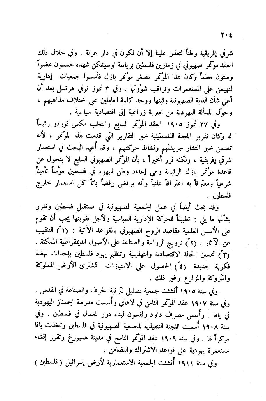 شرقي إفريقية وطناً لتعذر علينا إلا أن نكون في دار عزلة. وفي خلال ذلك انعقد مؤتمر صهيوني في زمارين فلسطين برياسة اوسيشكن شهده خمسون عضواً وستون معلماً وكان هذا المؤتمر مصغر مؤتمر بازل فأسسوا جمعيات إدارية لتهيمن على المستعمرات وتراقب شؤونها. وفي 3 تموز توفي هرتسل بعد أن أعلى شأن الغاية الصهيونية وثبتها ووحد كلمة العملين على اختلاف مذاهبهم، وحوّل المسألة اليهودية من خيرية زراعية إلى اقتصادية سياسية.