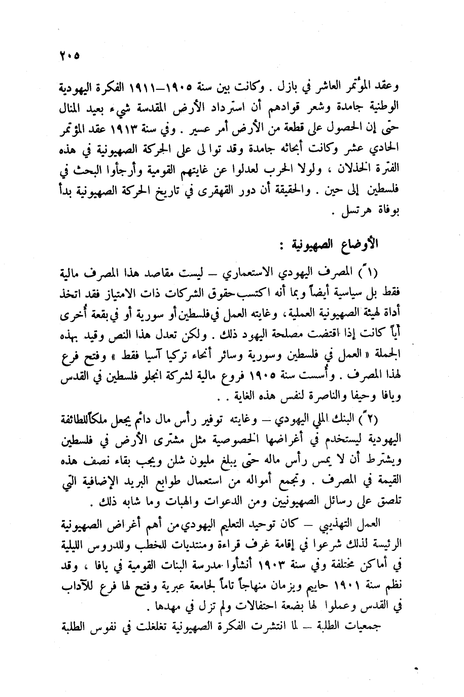 وعقد المؤتمر العاشر في بازل. وكانت بين سنة 1905 - 1911 الفكرة اليهودية الوطنية جامدة وشعر قوادهم أن استرداد الأرض المقدسة شيء بعيد المنال حتى إن الحصول على قطعة من الأرض أمر عسير. وفي سنة 1913 عقد المؤتمر الحادي عشر وكانت أبحاثه جامدة وقد توالى على الحركة الصهيونية في هذه الفترة الخذلان، ولولا الحرب لعدلوا عن غايتهم القومية وأرجئوا البحث في فلسطين إلى حين. والحقيقة أن دور القهقري في تاريخ الحركة الصهيونية بدأ بوفاة هرتسل.