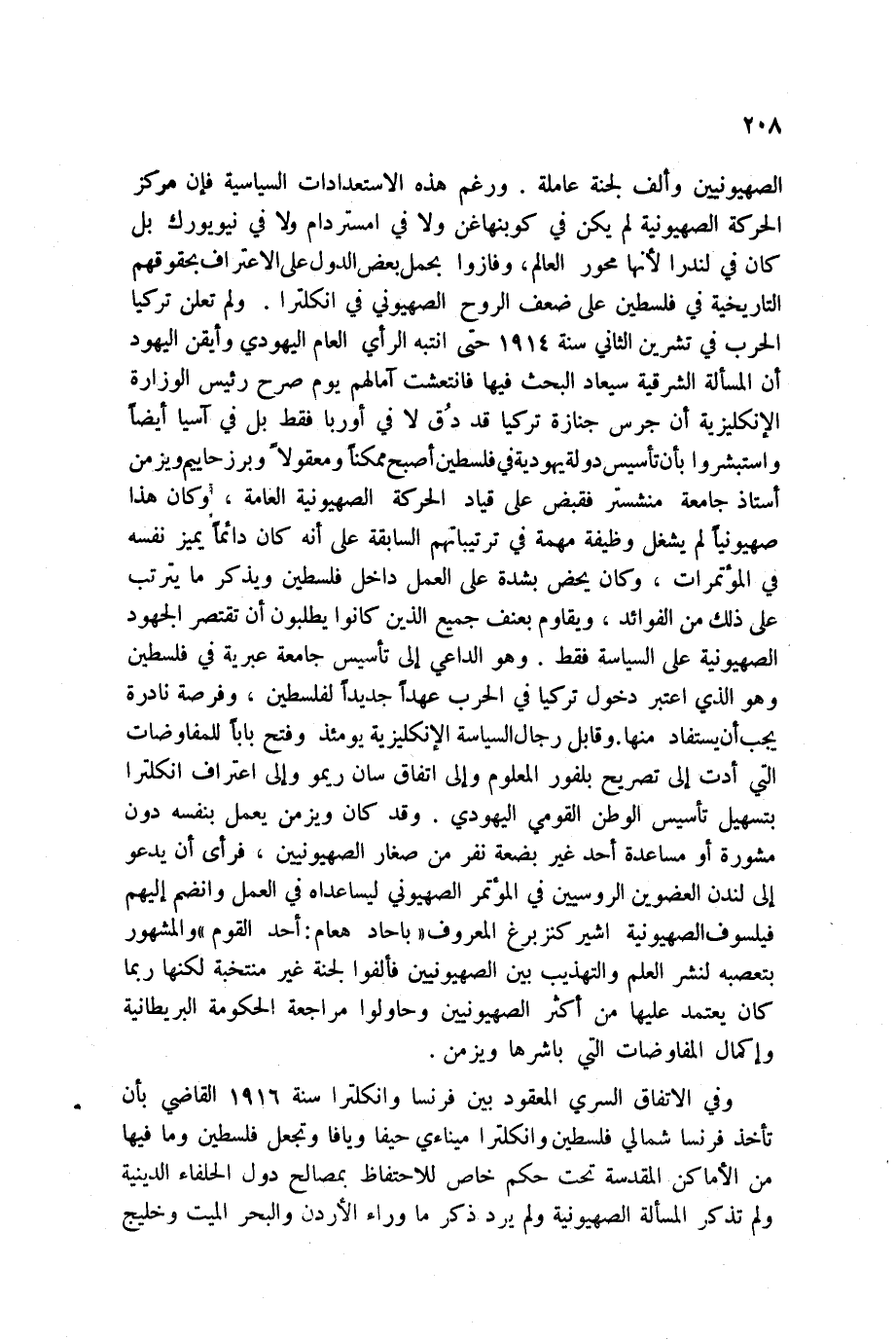 الصهيونيين وألف لجنة عاملة. ورغم هذه الاستعدادات السياسية فإن مركز الحركة الصهيونية لم يكن في كوبنهاغن ولا في أمستردام ولا في نيويورك بل كان في لندرا لأنها محور العالم، وفازوا بحمل بعض الدول على الاعتراف بحقوقهم التاريخية في فلسطين على ضعف الروح الصهيوني في إنكلترا. ولم تعلن تركيا الحرب في تشرين الثاني سنة 1914 حتى انتبه الرأي العام اليهودي وأيقن اليهود أن المسألة الشرقية سيعاد البحث فيها فانتعشت آمالهم يوم صرح رئيس الوزارة الإنكليزية أن جرس جنازة تركيا قد دُق لا في أوربا فقط بل في آسيا أيضاً واستبشروا بأن تأسيس دولة يهودية في فلسطين أصبح ممكناً ومعقولاً وبرز حاييم ويزمن أستاذ جامعة منشستر فقبض على قياد الحركة الصهيونية العامة، وكان هذا صهيونياً لم يشغل وظيفة مهمة في ترتيباتهم السابقة على أنه كان دائماً يميز نفسه في المؤتمرات، وكان يحض بشدة على العمل داخل فلسطين ويذكر ما يترتب على ذلك من الفوائد، ويقاوم بعنف جميع الذين كانوا يطلبون أن تقتصر الجهود الصهيونية على السياسة فقط. وهو الداعي إلى تأسيس جامعة عبرية في فلسطين وهو الذي اعتبر دخول تركيا في الحرب عهداً جديداً لفلسطين، وفرصة نادرة يجب أن يستفاد منها. وقابل رجال السياسة الإنكليزية يومئذ وفتح باباً للمفاوضات التي أدت إلى تصريح بلفور المعلوم وإلى اتفاق سان ريمو وإلى اعتراف إنكلترا بتسهيل تأسيس الوطن الثومي اليهودي. وقد كان ويزمن يعمل بنفسه دون مشورة أو مساعدة أحد غير بضعة نفر من صغار الصهيونيين، فرأى أن يدعو إلى لندن العضوين الروسيين في المؤتمر الصهيوني ليساعداه في العمل وانضم إليهم فيلسوف