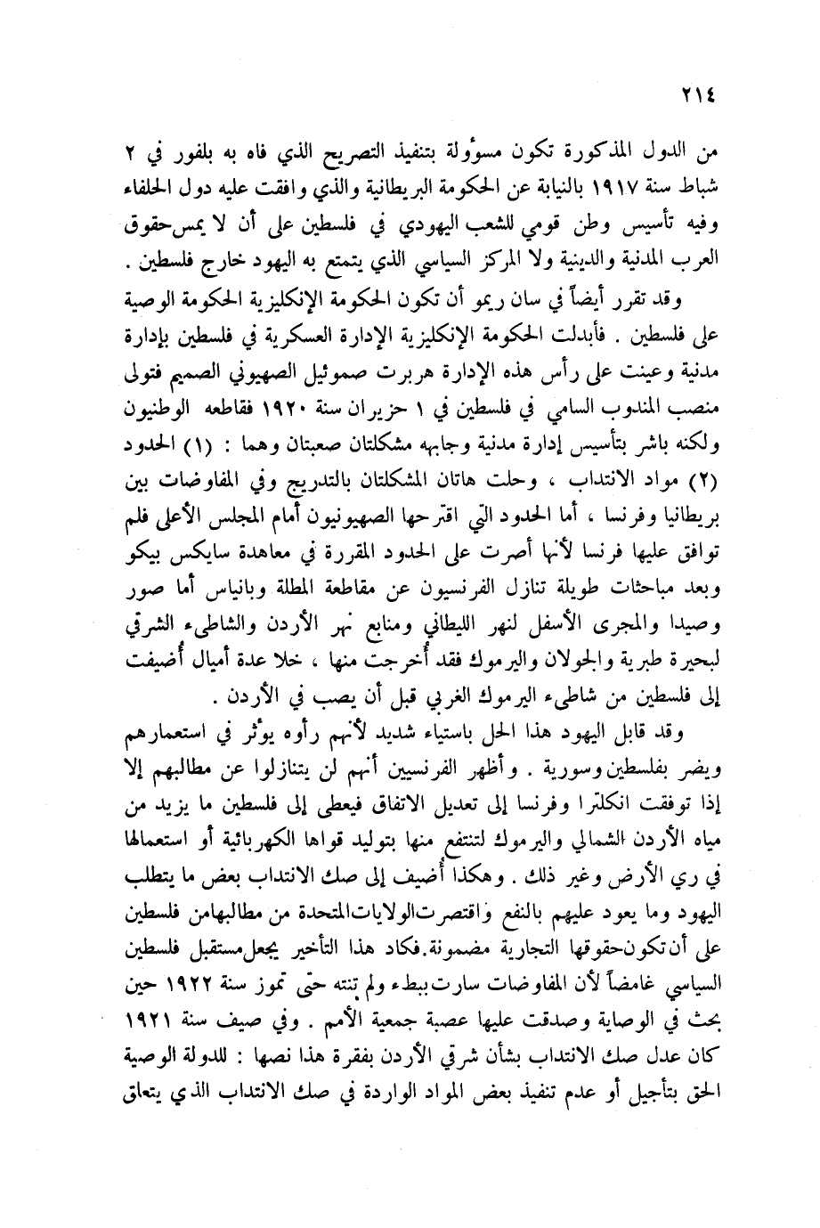 وقد قابل اليهود هذا الحل باستياء شديد لأنهم رأوه يؤثر في استعمارهم ويضر بفلسطين وسورية. وأظهر الفرنسيين أنهم لن يتنازلوا عن مطالبهم إلا إذا توقفت إنكلترا وفرنسا إلى تعديل الاتفاق فيعطى إلى فلسطين ما يزيد من مياه الأردن الشمالي واليرموك لتنتفع منها بتوليد قواها الكهربائية أو استعمالها في ري الأرض وغير ذلك. وهكذا أُضيف إلى صك الانتداب بعض ما يتطلب اليهود وما يعود عليهم بالنفع واقتصرت الولايات المتحدة من مطالبها من فلسطين على أن تكون حقوقها التجارية مضمونة. فكاد هذا التأخير يجعل مستقبل فلسطين السياسي غامضاً لأن المفاوضات سارت ببطء ولم تنته حتى تموز سنة 1922 حين بحث في الوصاية وصدقت عليها عصبة جمعية الأمم. وفي صيف سنة 1921 كان عدل صك الانتداب بشأن شرقي الأردن بفقرة هذا نصها: للدولة الوصية الحق بتأجيل أو عدم تنفيذ بعض المواد الواردة في صك الانتداب الذي يتعلق