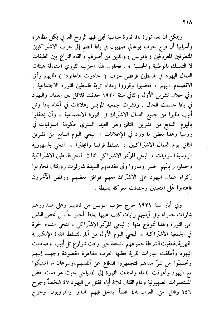 وفي أيار سنة 1921 خرج حزب الموبس من ناديهم وعلى صدورهم شارات حمراء وفي أيديهم رايات كتب عليها بخط أحمر جمل تحض الناس على الثورة وهذا نموذج منها: ليحي المؤتمر الاشتراكي، لتحي النساء الحرة في الجمعية الاشتراكية، ليحي اليوم الأول من أيار. لتسقط القوة الإنكليزية القهرية. فتعقبت الشرطة جموعهم المندفعة حتى وافت شوارع تل أبيب وصادمت اليهود وأطلقت عيارات نارية فظنها العرب مظاهرة مقصودة وجهت إليهم وتحسبوا من شرّ مداهم فتجمهروا للدفاع عن أنفسهم، وسرعان ما اشتبكوا مع اليهود وأهرقت الدماء وامتدت الثورة إلى الضواحي حيث هوجمت بعض المستعمرات الصهيونية ودام القتال ثلاثة أيام فقتل من اليهود 47 شخصاً وجرح 146 وقتل من العرب 48 نفساً يدخل فيهم البدو والقرويون وجرح