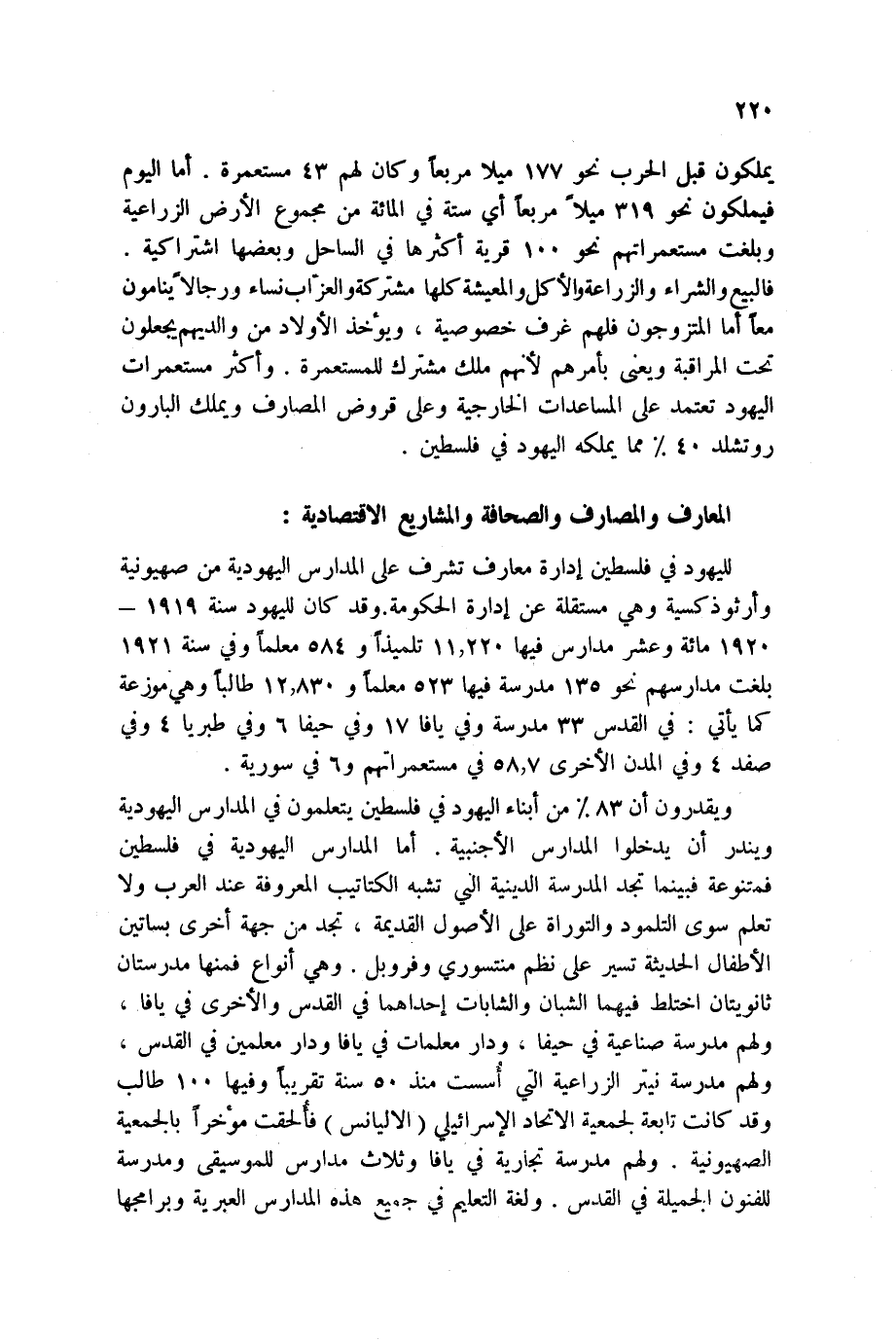 يملكون قبل الحرب نحو 177 ميلا مربعاً وكان لهم 43 مستعمرة. أما اليوم فيملكون نحو 319 ميلاً مربعاً أي ستة في المائة من مجموع الأرض الزراعية وبلغت مستعمراتهم نحو 100 قرية أكثرها في الساحل وبعضها اشتراكية. فالبيع والشراء والزراعة والأكل والمعيشة كلها مشتركة والعزّاب نساء ورجالاً ينامون معاً أما المتزوجون فلهم غرف خصوصية، ويؤخذ الأولاد من والديهم يجعلون تحت المراقبة ويعنى بأمرهم لأنهم ملك مشترك للمستعمرة. وأكثر مستعمرات اليهود تعتمد على المساعدات الخارجية وعلى قروض المصارف ويملك البارون روتشلد 40بالمائة مما يملكه اليهود في فلسطين.