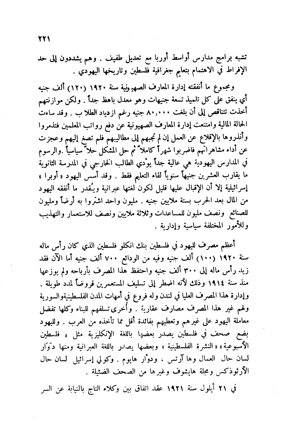 ومجموع ما أنفقته إدارة المعارف الصهيونية سنة 1920 120 ألف جنيه أي ينفق على كل تلميذ تسعة جنيهات وهو معدل باهظ جداً. ولكن موازنتهم أخذت تتناقص إلى أن بلغت 80000 جنيه رغم ازدياد الطلاب. وقد ساءت الحالة المالية وامتنعت إدارة المعارف الصهيونية عن دفع رواتب المعلمين فتذمروا وأنذروها بالإقلاع عن العمل إن لم تجبهم إلى مطاليبهم فلم تصغ إليهم وعجزت عن أداء مشاهراتهم فاضربوا شهراً كاملاً ثم حل المشكل حلاً سياسياً. والرسوم في المدارس اليهودية هي عالية جداً يؤدي الطالب الخارجي في المدرسة الثانوية ما يقارب العشرين جنيهاً سنوياً لقاء التعليم فقط. وقد أسس اليهود أوبرا إسرائيلية إلا أن الإقبال عليها قليل لكون لغتها عبرانية ويُقدر ما أنفقه اليهود من المال بعد الحرب بستة ملايين جنيه. مليون واحد اشتروا به أرضاً ومليون للصنائع ونصف مليون للمساعدات وثلاثة ملايين ونصف للاستعمار والتهذيب وللأمور المختلفة سياسية وإدارية.