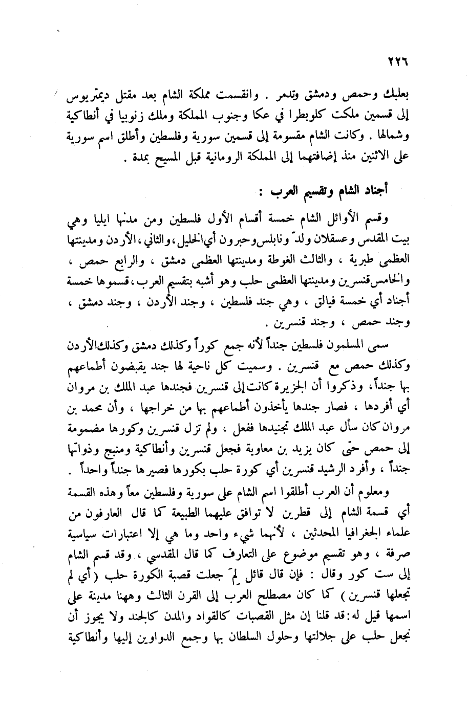 ومعلوم أن العرب أطلقوا اسم الشام على سورية وفلسطين معاً وهذه القسمة أي قسمة الشام إلى قطرين لا توافق عليهما الطبيعة كما قال العارفون من علماء الجغرافيا المحدثين، لأنهما شيء واحد وما هي إلا اعتبارات سياسية صرفة، وهو تقسيم موضوع على التعارف كما قال المقدسي، وقد قسم الشام إلى ست كور وقال: فإن قال قائل لم جعلت قصبة الكورة حلب أي لم تجعلها قنسرين كما كان مصطلح العرب إلى القرن الثالث وههنا مدينة على اسمها قيل له: قد قلنا إن مثل القصبات كالقواد والمدن كالجند ولا يجوز أن نجعل حلب على جلالتها وحلول