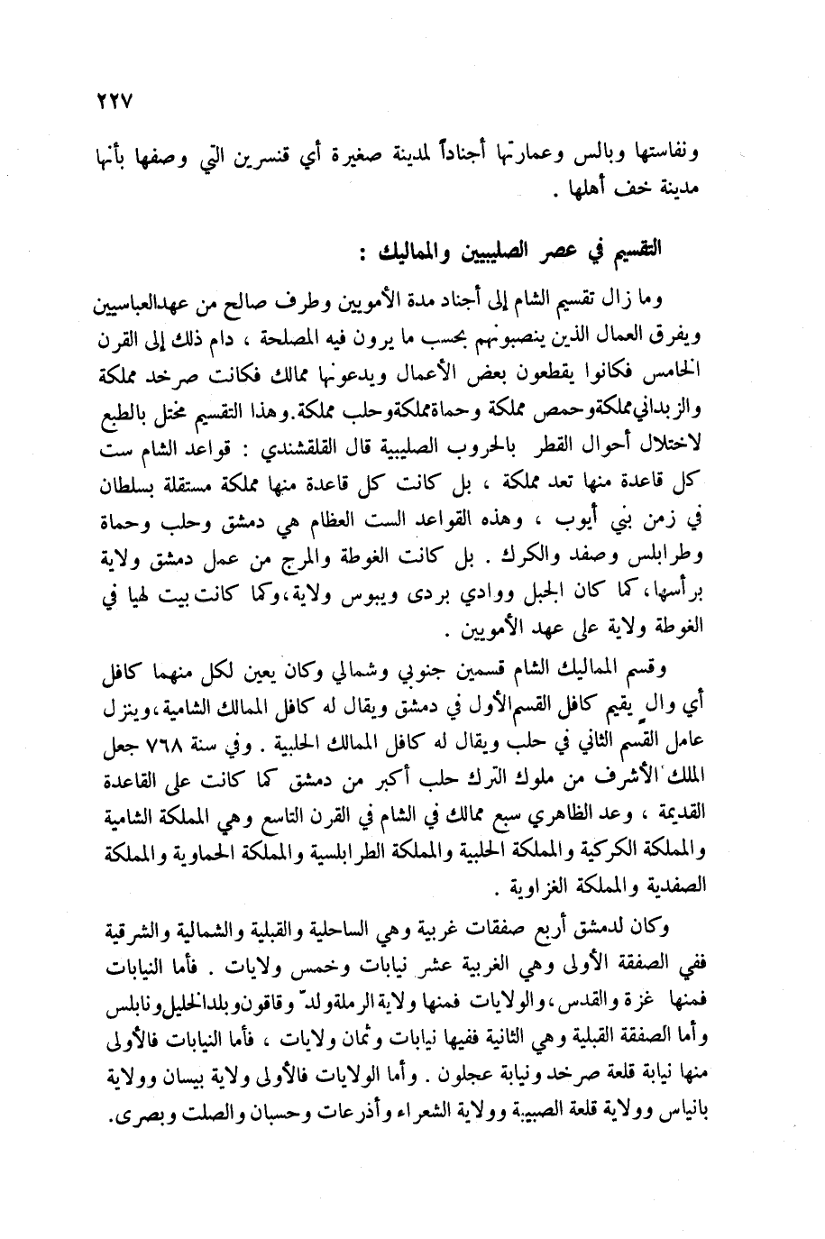 وما زال تقسيم الشام إلى أجناد مدة الأمويين وطرف صالح من عهد العباسيين ويفرق العمال الذين ينصبونهم بحسب ما يرون فيه المصلحة، دام ذلك إلى القرن الخامس فكانوا يقطعون بعض الأعمال ويدعونها ممالك فكانت صرخد مملكة والزبداني مملكة وحمص مملكة وحماة مملكة وحلب مملكة. وهذا التقسيم مختل بالطبع لاختلال أحوال القطر بالحروب الصليبية قال القلقشندي: قواعد الشام ست كل قاعدة منها تعد مملكة، بل كانت كل قاعدة منها مملكة مستقلة بسلطان في زمن بني أيوب، وهذه القواعد الست العظام هي دمشق وحلب وحماة وطرابلس وصفد والكرك. بل كانت الغوطة والمرج من عمل دمشق ولاية برأسها، كما كان الجبل ووادي بردى ويبوس ولاية، وكما كانت بيت لهيا في الغوطة ولاية على عهد الأمويين.