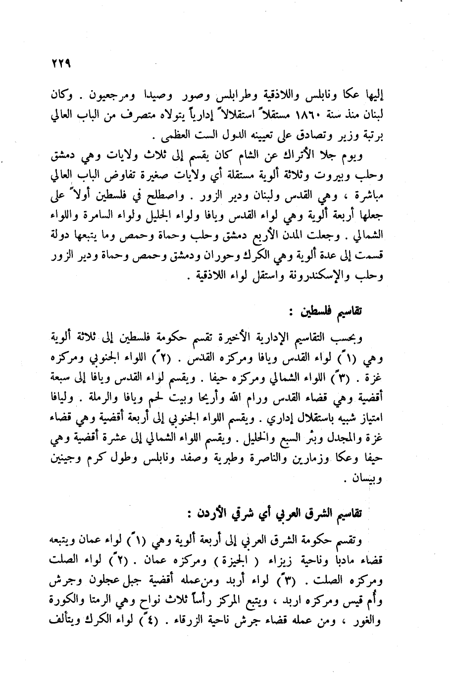 ويوم جلا الأتراك عن الشام كان يقسم إلى ثلاث ولايات وهي دمشق وحلب وبيروت وثلاثة ألوية مستقلة أي ولايات صغيرة تفاوض الباب العالي مباشرة، وهي القدس ولبنان ودير الزور. واصطلح في فلسطين أولاً على جعلها أربعة ألوية وهي لواء القدس ويافا ولواء الجليل ولواء السامرة واللواء الشمالي. وجعلت المدن الأربع دمشق وحلب وحماة وحمص وما يتبعها دولة قسمت إلى عدة ألوية وهي الكرك وحوران ودمشق وحمص وحماة ودير الزور وحلب والإسكندرونة واستقل لواء اللاذقية.